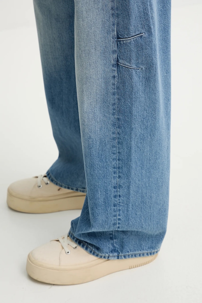 - Luźny fason. - Model z pięcioma klasycznymi, wsuwanymi kieszeniami - trzy z przodu i dwie z tyłu. - Model z podwyższoną talią i zapięciem na guziki. - Ozdobnie sprany denim. - Długość wewnętrzna nogawki: 74 cm. - Długość zewnętrzna nogawki: 105 cm. - Szerokość w pasie: 40 cm. - Wysokość stanu: 30 cm. - Szerokość nogawki na dole: - Wymiary podane dla rozmiaru: 27/30