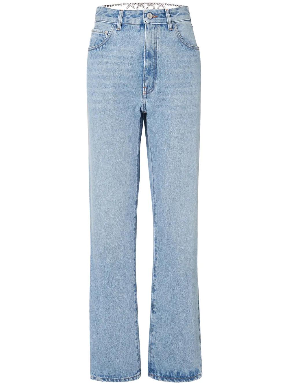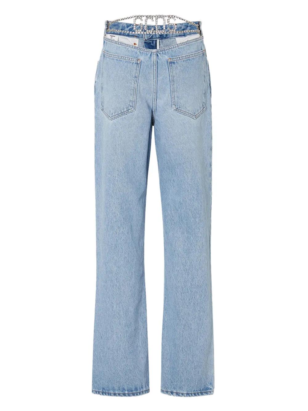 light blue cotton denim front button and zip fastening belt loops classic five pockets crystal embellishment straight leg