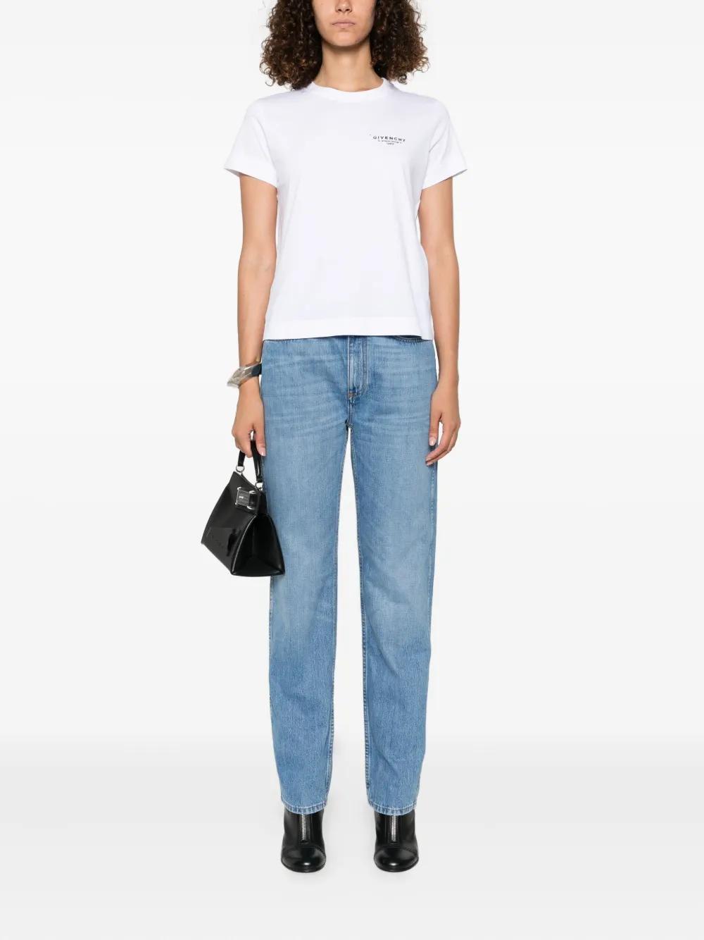medium blue five-pocket styling button fly straight leg high waist cotton construction