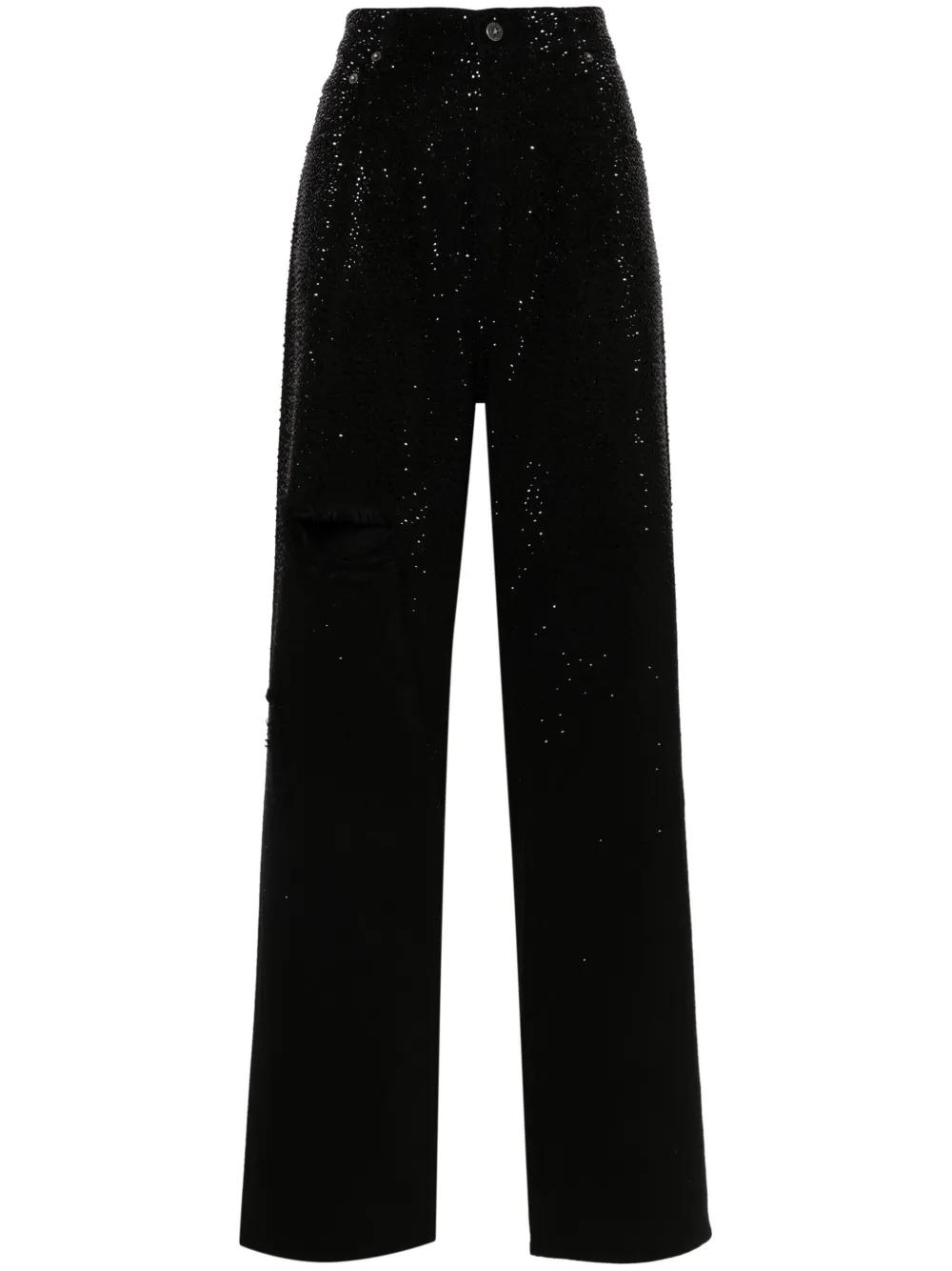 black cotton denim crystal embellishment belt loops ripped detailing classic five pockets logo patch to the rear star stud detailing tapered leg concealed fly and button fastening
