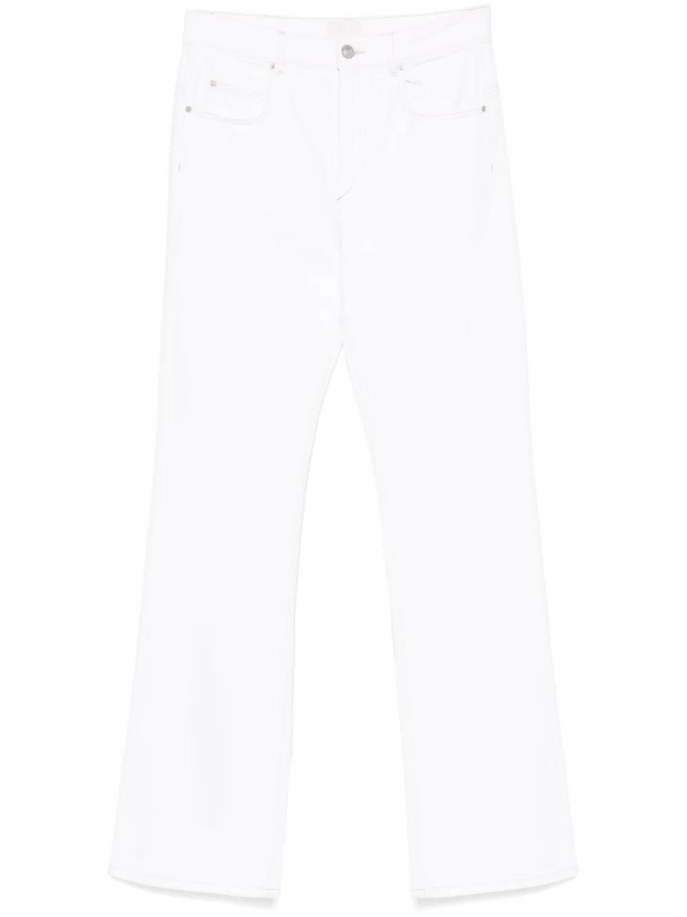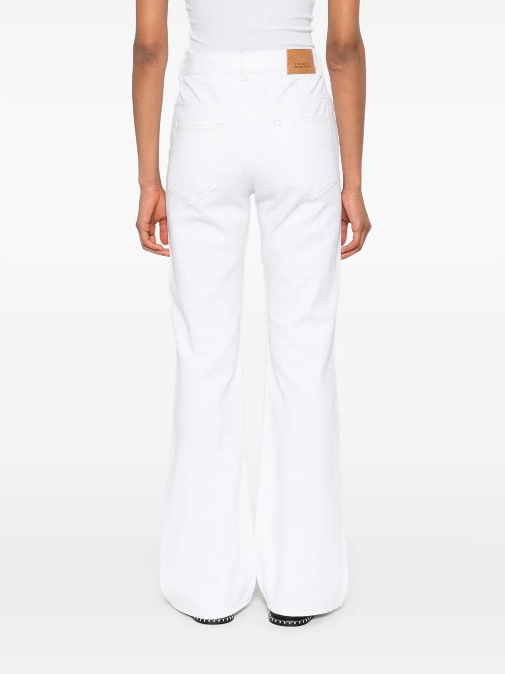 white front button and zip fastening belt loops classic five pockets logo patch to the rear