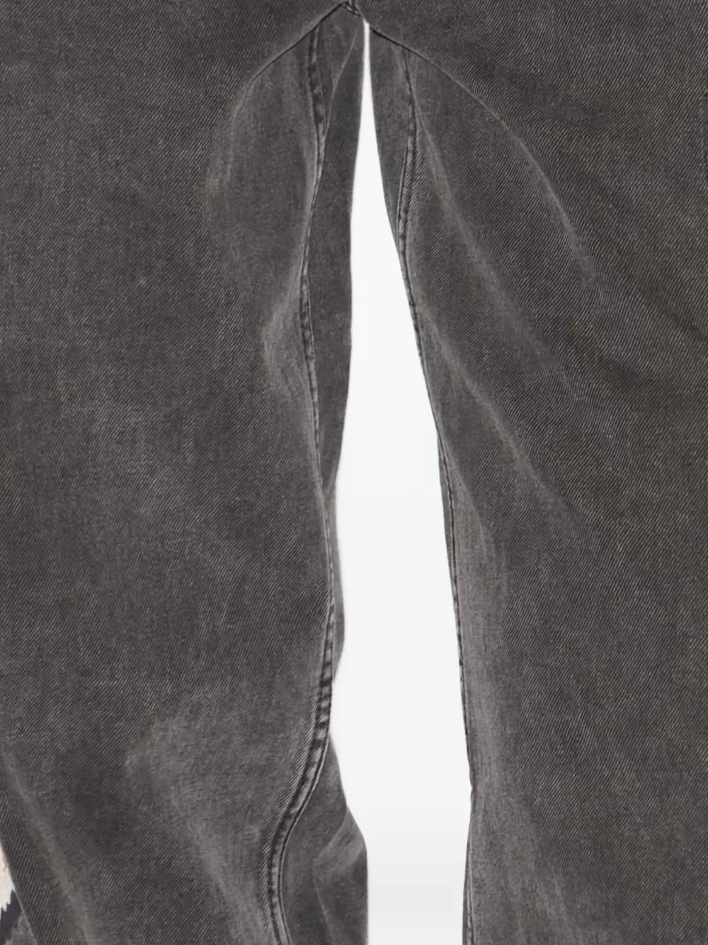 dark grey graphic embroidery side fringe detailing belt loops five pockets button and zip fastening leather logo patch
