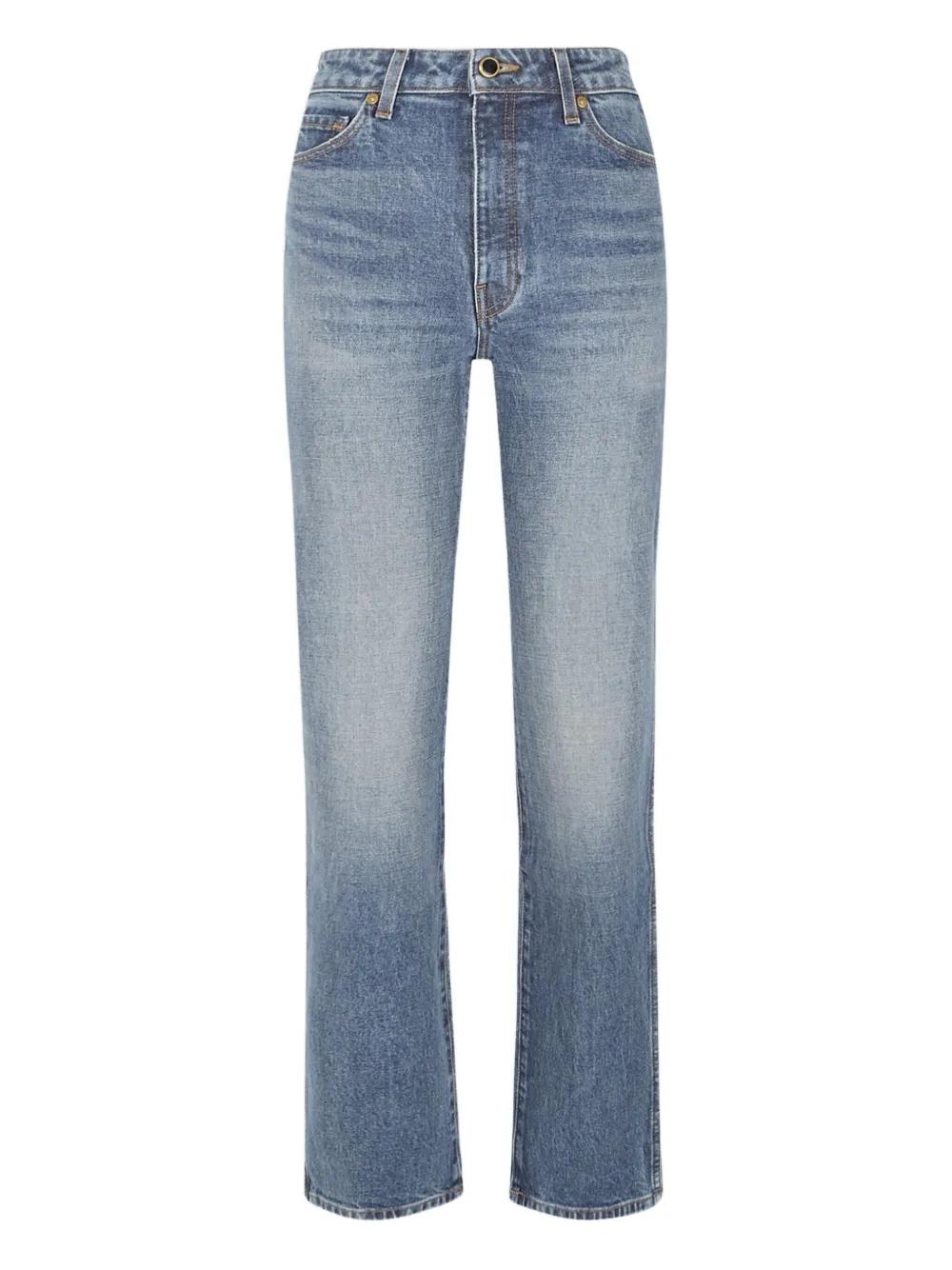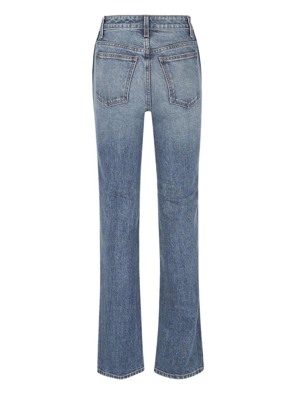 blue organic cotton-blend high waist belt loops front button and zip fastening classic five pockets faded effect flared