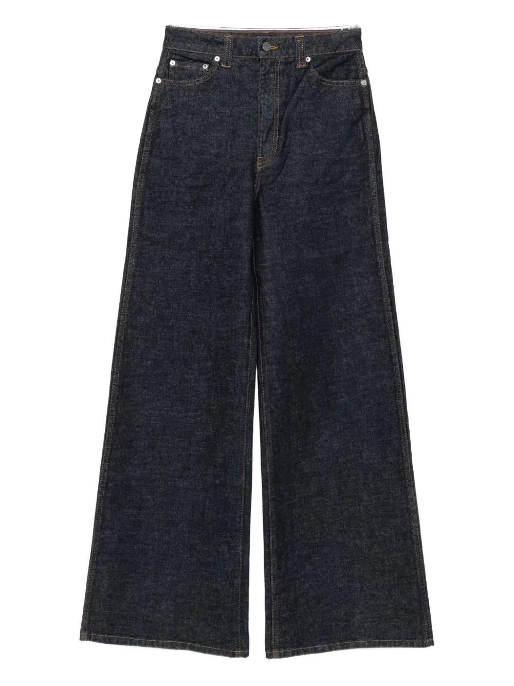 blue wide leg front button and zip fastening belt loops classic five pockets