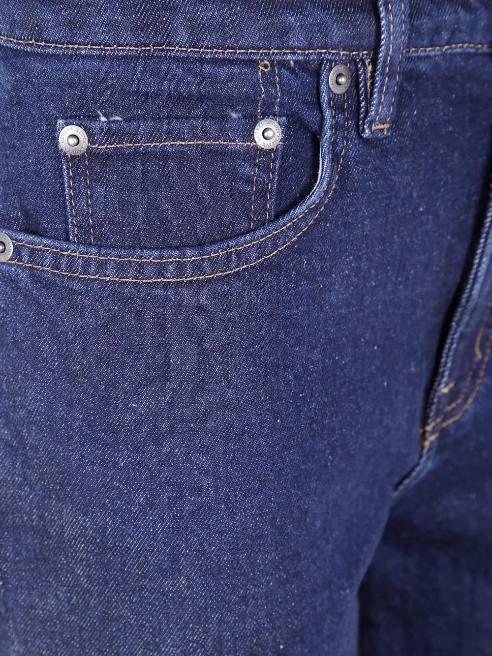 blue five-pocket design front button and zip fastening belt loops contrast stitching high-rise
