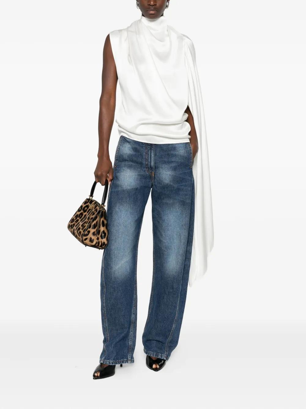dark blue seam detail five pockets belt loops top button fastening zip fly