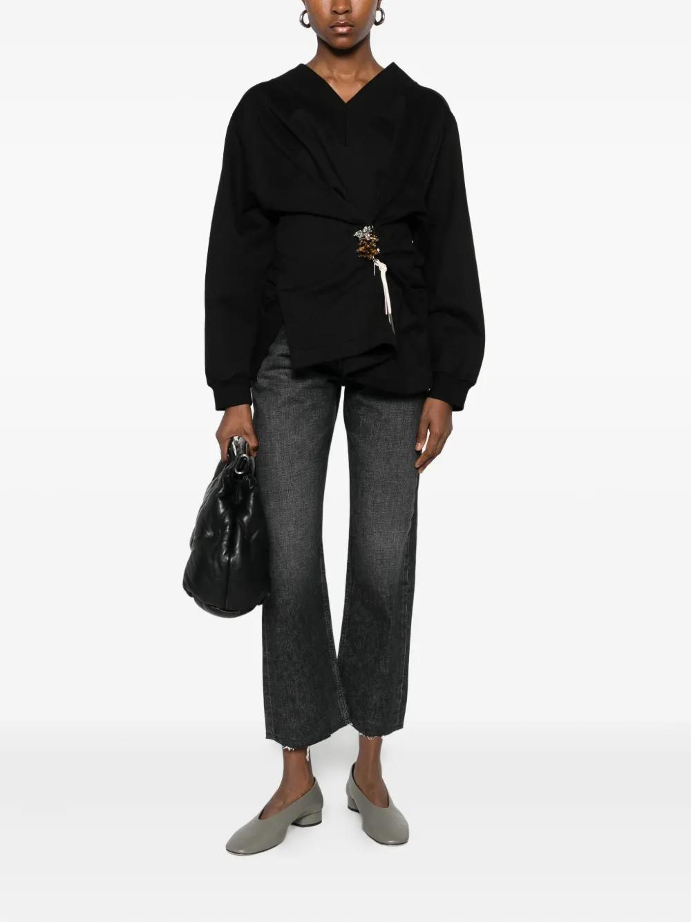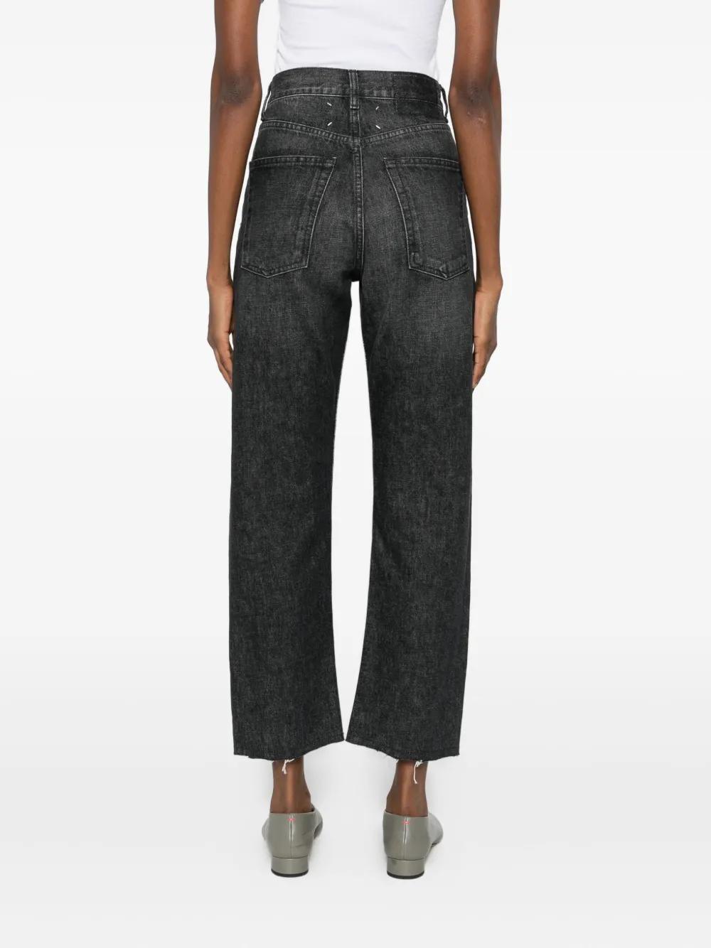 grey front button and zip fastening classic five pockets frayed hem rear logo patch