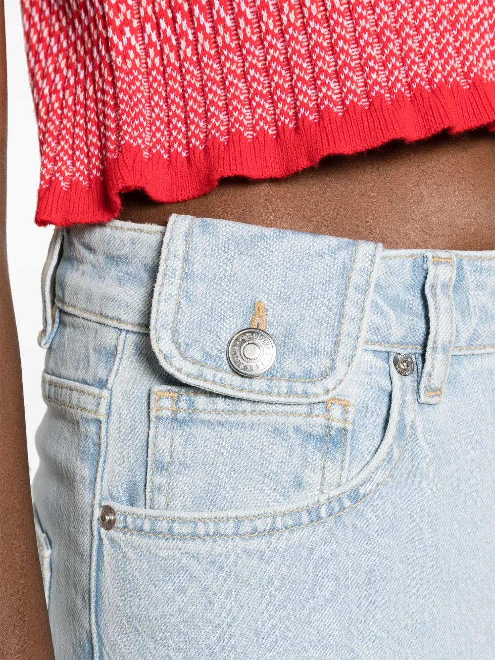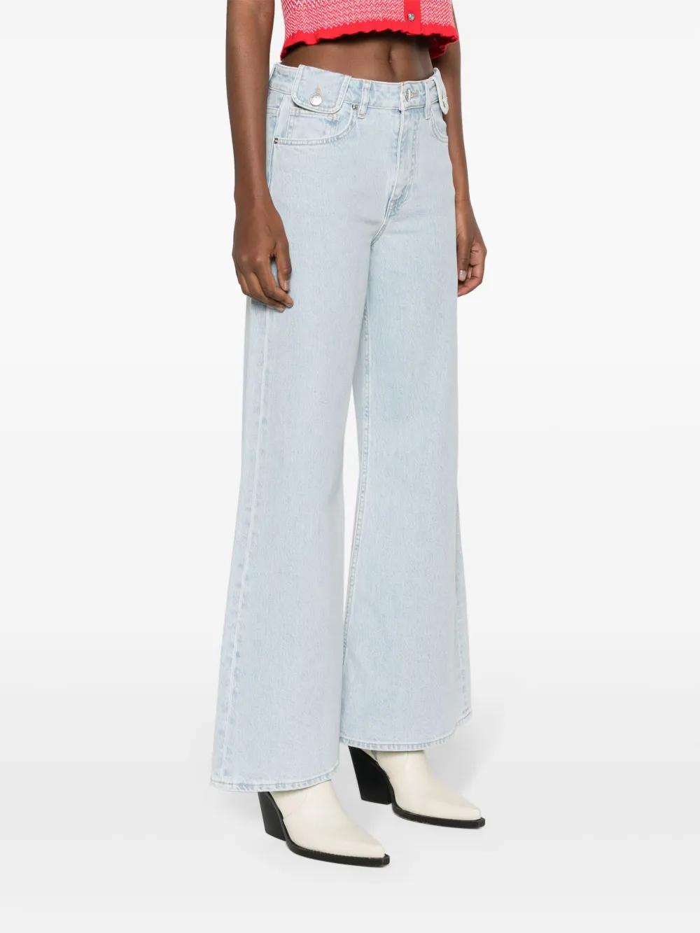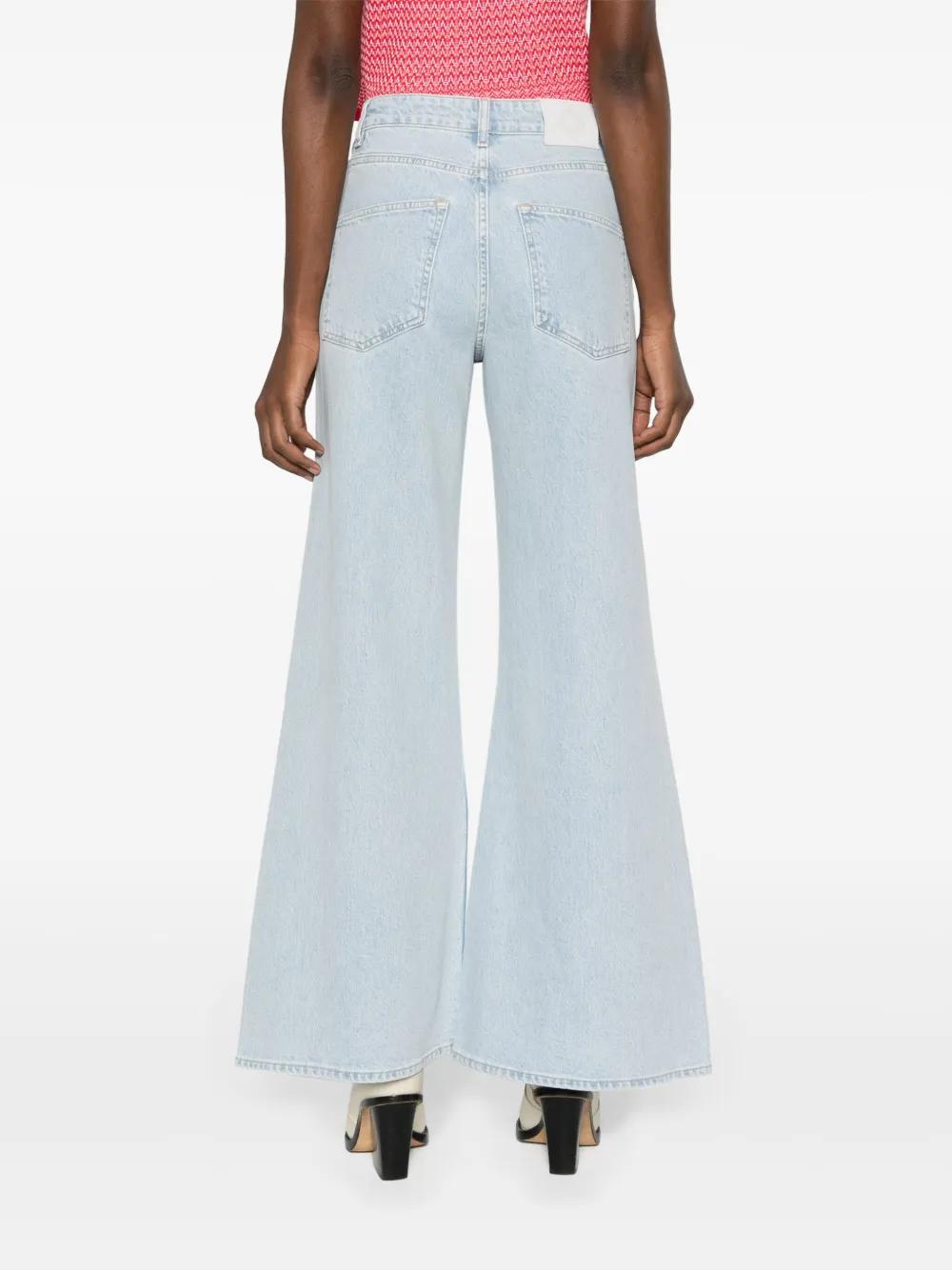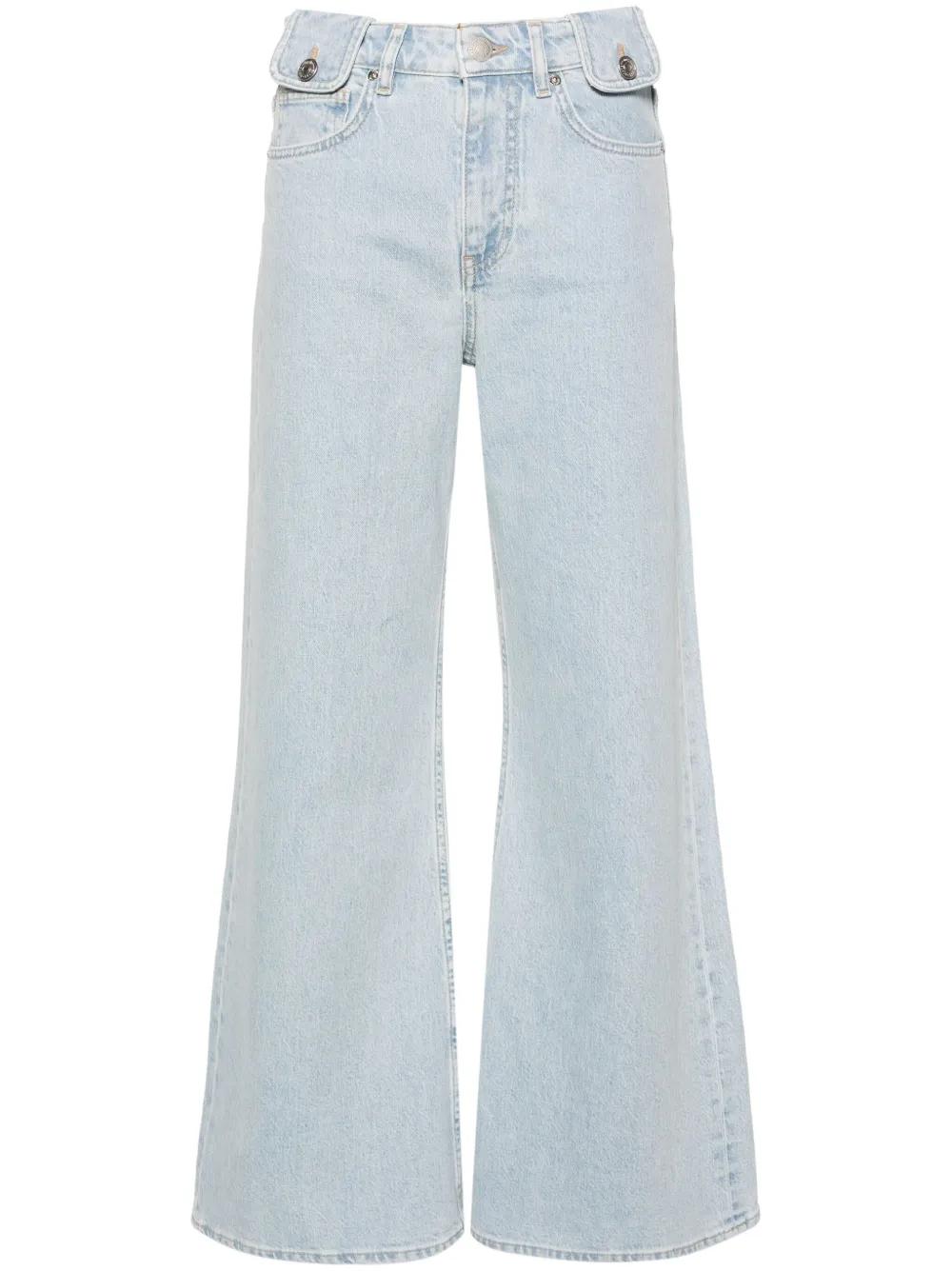 light blue cotton denim high-rise wide leg logo patch to the rear decorative button flap contrast stitching metal eyelet detailing belt loops front button and zip fastening classic five pockets straight hem