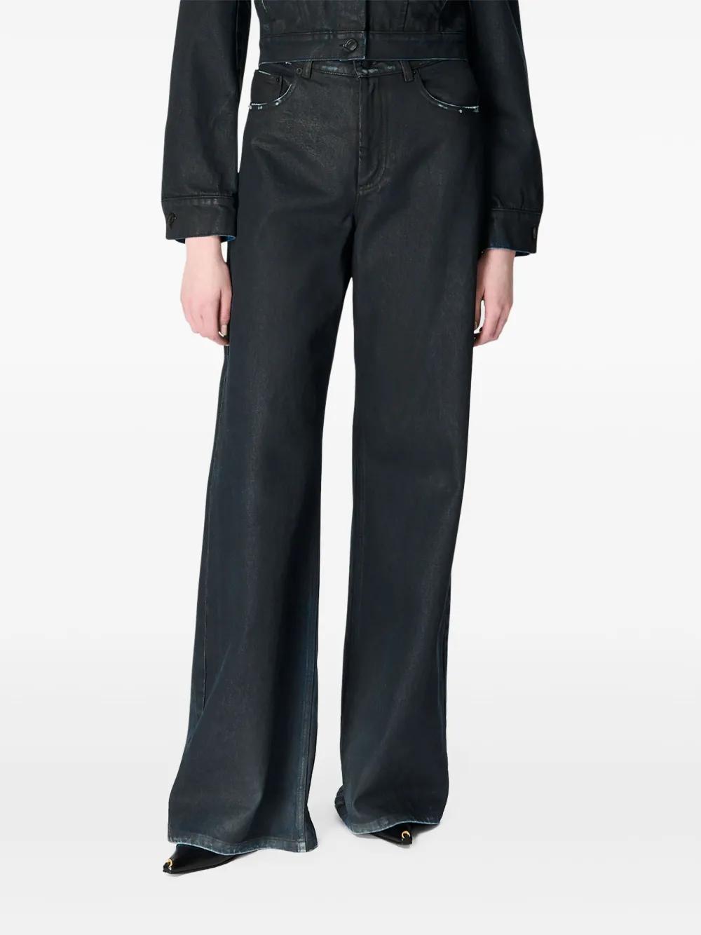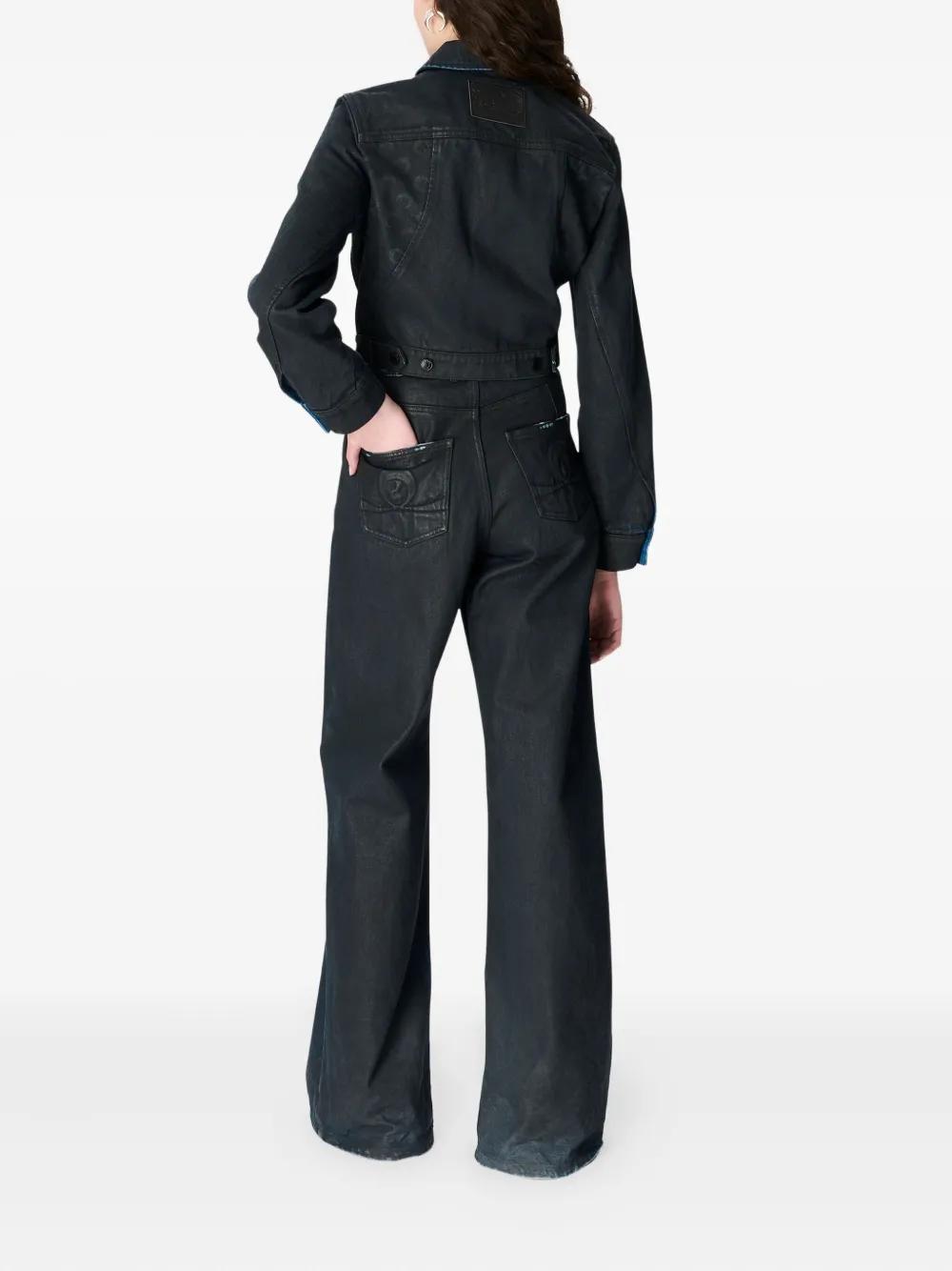 black cotton waxed denim high waist belt loops button fly fastening classic five pockets rear logo patch embroidered logo