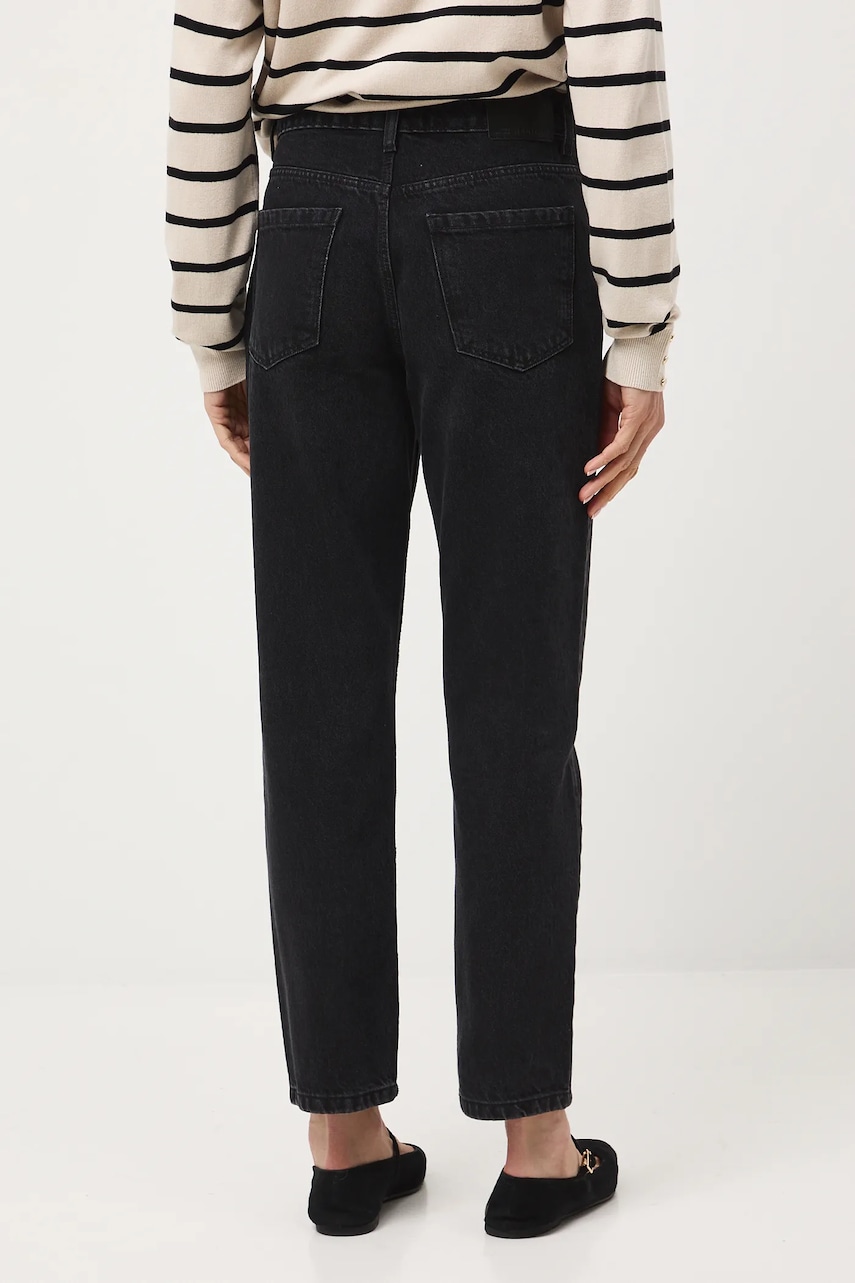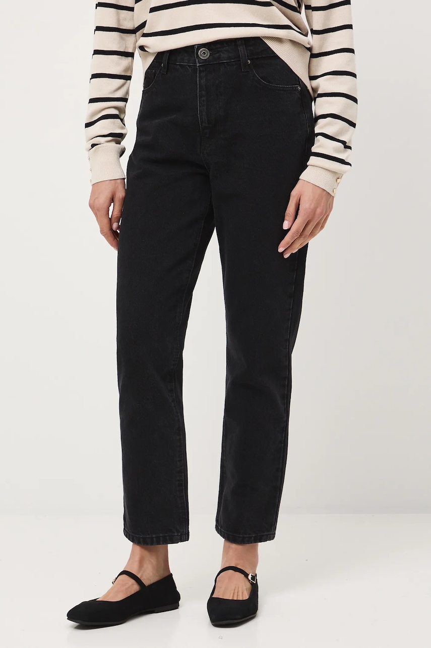 - Fason mom fit - jeansy inspirowane stylem vintage, o luźniejszym kroju, szczególnie w okolicy bioder i delikatnie zwężających się nogawkach. Krój mom fit optycznie zwęża talię oraz podkreśla partię ud, zachowując przy tym komfort noszenia. - Model z podwyższoną talią i zapięciem na guzik i suwak. - Wsuwane kieszenie. - Skrócona nogawka. - Ozdobnie sprany denim. - Szerokość w pasie: 38 cm. - Szerokość w biodrach: 49 cm. - Wysokość stanu: 27 cm. - Szerokość nogawki na dole: 17,5 cm. - Długość wewnętrzna nogawki: 72 cm. - Wymiary podane dla rozmiaru: 36.