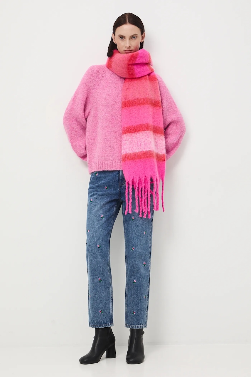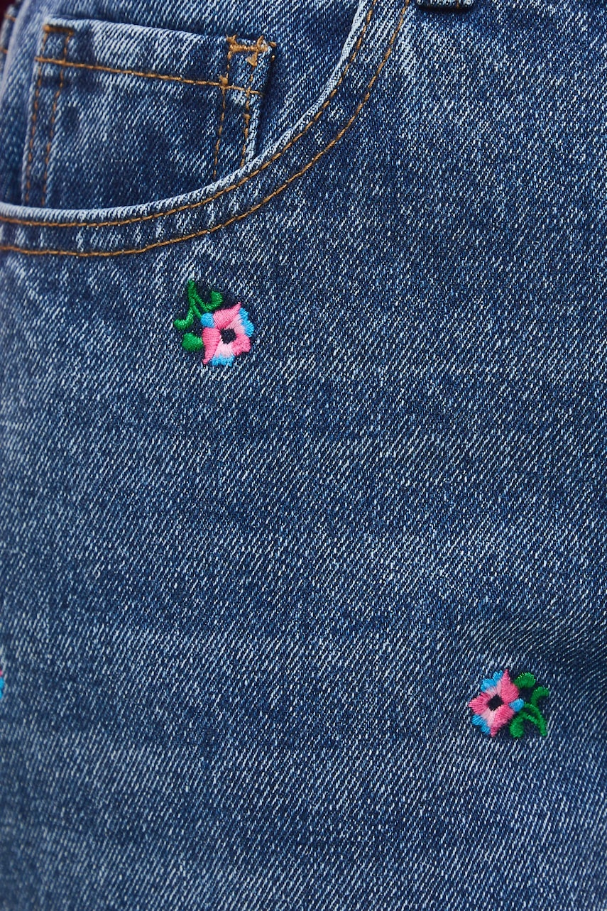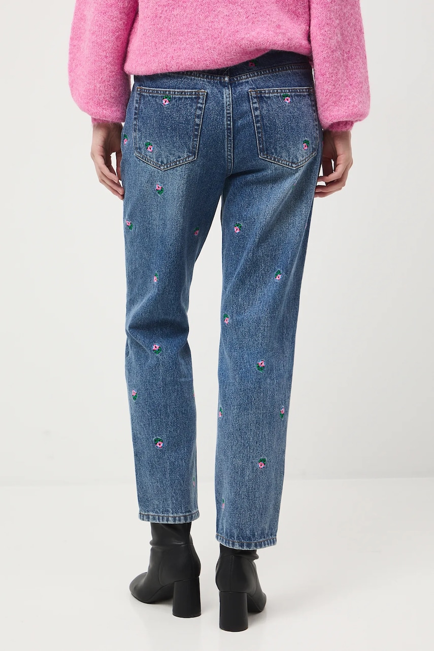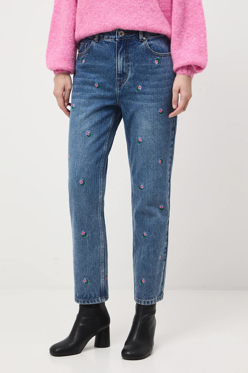- Fason mom fit - jeansy inspirowane stylem vintage, o luźniejszym kroju, szczególnie w okolicy bioder i delikatnie zwężających się nogawkach. Krój mom fit optycznie zwęża talię oraz podkreśla partię ud, zachowując przy tym komfort noszenia. - Model z podwyższoną talią i zapięciem na guzik i suwak. - Wsuwane kieszenie. - Model z ozdobnymi haftami. - Ozdobnie sprany denim. - Szerokość w pasie: 37 cm. - Szerokość w biodrach: 49 cm. - Wysokość stanu: 28 cm. - Szerokość nogawki na dole: 18 cm. - Długość wewnętrzna nogawki: 70 cm. - Wymiary podane dla rozmiaru: 36.