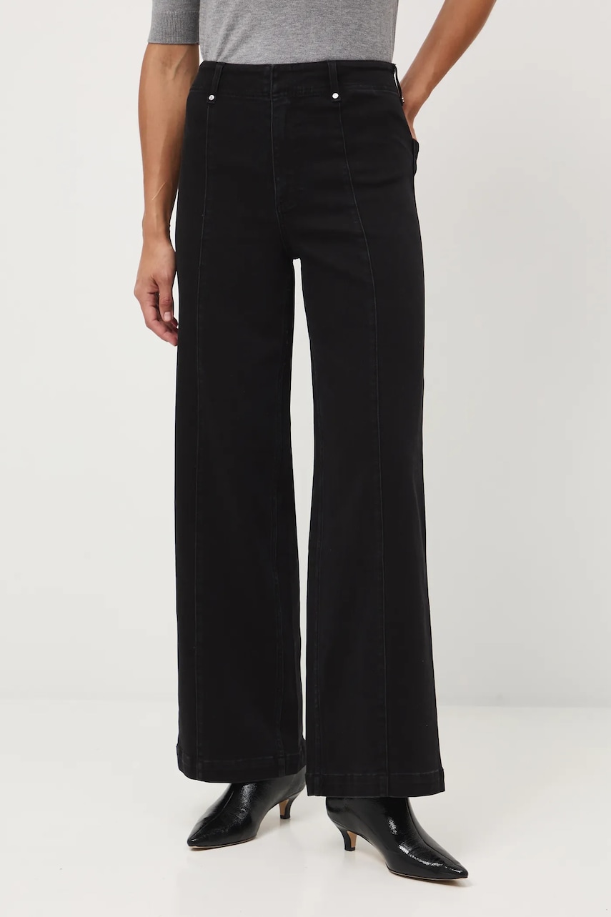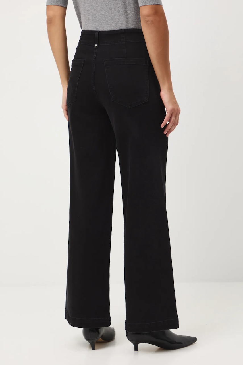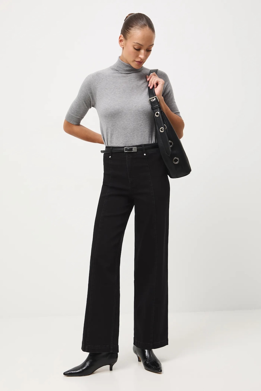- Fason wide leg - jeansy lekko dopasowane w okolicy bioder z charakterystyczną szeroką nogawką, która stopniowo poszerza się od talii, aż do samego dołu. Krój akcentuje wcięcie w talii, a luźny dół nie krępuje ruchów. - Model z podwyższoną talią z zapięciem na suwak i haftkę. - Wsuwane kieszenie. - Materiał z ozdobnymi przeszyciami. - Delikatnie sprany denim. - Szerokość w pasie: 36,5 cm. - Szerokość w biodrach: 47 cm. - Wysokość stanu: 29,7 cm. - Szerokość nogawki na dole: 29,5 cm. - Długość wewnętrzna nogawki: 81 cm. - Wymiary podane dla rozmiaru: 38.