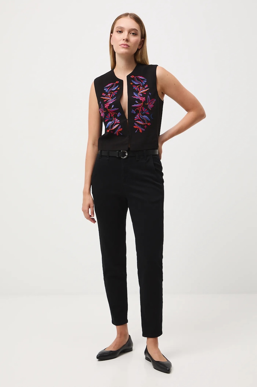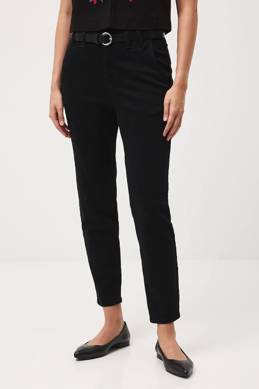 - Fason carrot - jeansy luźniejsze w okolicach bioder, których nogawka lekko zwęża się ku dołowi. Krój ten podkreśla linię talii, optycznie ją wysmukla i pozwala wyrównać proporcje w sylwetce. Idealnie nadają się do stworzenia stylizacji o bardziej formalnym charakterze, przy zachowaniu niezobowiązującego luzu, jaki daje jeans. - Model z podwyższoną talią i zapięciem na guzik i suwak. - Dołączony pasek ze skóry ekologicznej. - Wsuwane kieszenie. - Gładki materiał. - Ozdobne przeszycia. - Szerokość w pasie: 35,5 cm. - Szerokość w biodrach: 46 cm. - Wysokość stanu: 27,5 cm. - Szerokość nogawki na dole: 14,5 cm. - Długość wewnętrzna nogawki: 71 cm. - Wymiary podane dla rozmiaru: 36.