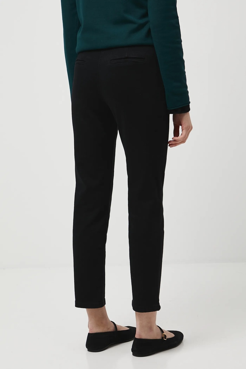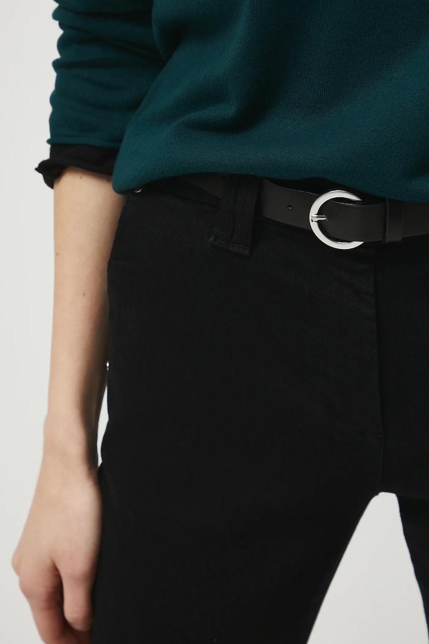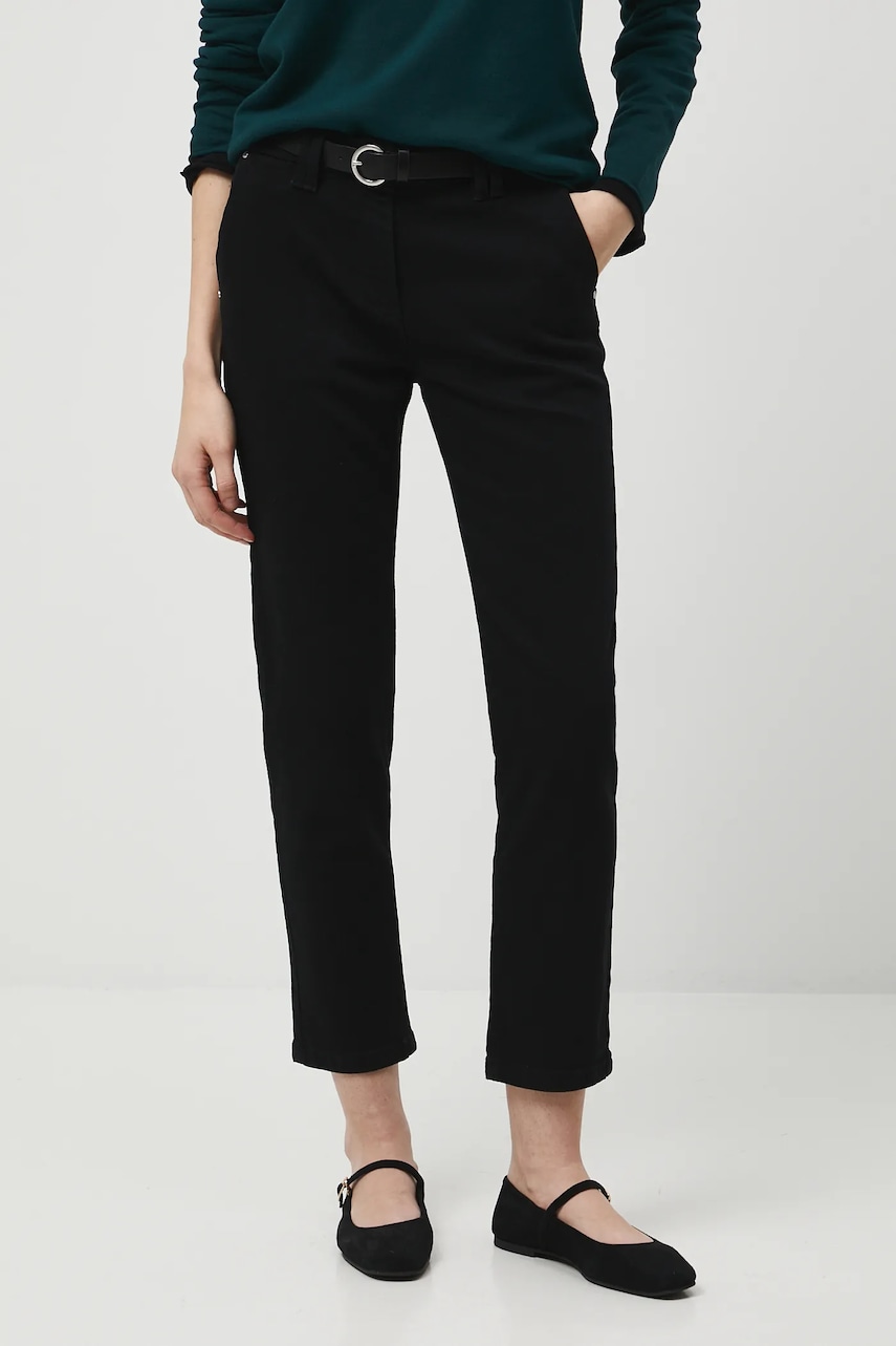 - Fason chino - jeansy charakteryzujące się skośnymi kieszeniami oraz prostą nogawką delikatnie zwężaną ku dołowi. Mają zwykle kieszenie z przodu i z tyłu, co nadaje im swobodny, ale jednocześnie praktyczny wygląd. Są luźniejsze w okolicach bioder, odpowiednie zarówno dla wysokich, jak i niskich sylwetek, a dobrze dobrane pomogą wyrównać proporcje w budowie ciała. - Model z regularną talią i zapięciem na guzik i suwak. - Dołączony pasek ze skóry ekologicznej. - Gładki materiał. - Szerokość w pasie: 37,5 cm. - Szerokość w biodrach: 48 cm. - Wysokość stanu: 25,5 cm. - Szerokość nogawki na dole: 17 cm. - Długość wewnętrzna nogawki: 71 cm. - Wymiary podane dla rozmiaru: 36.