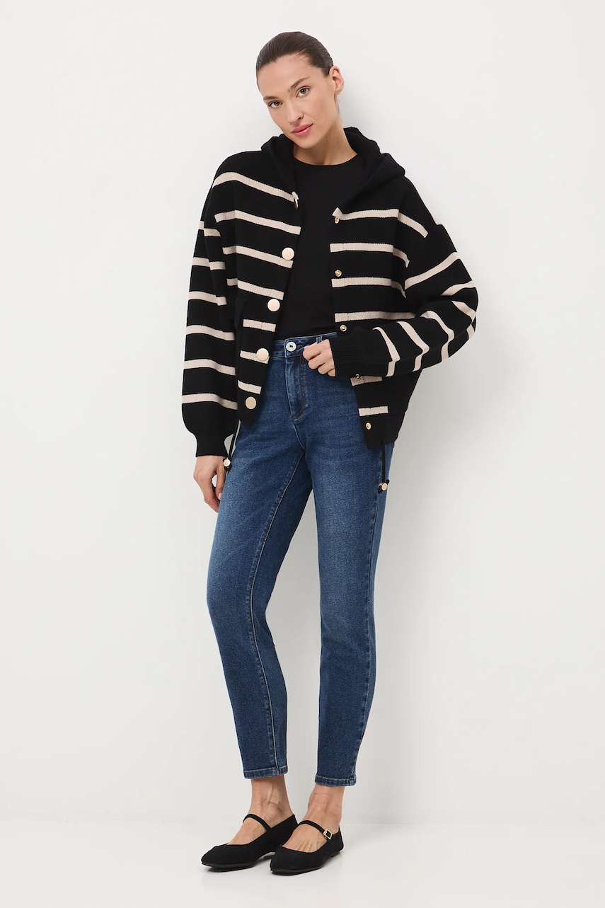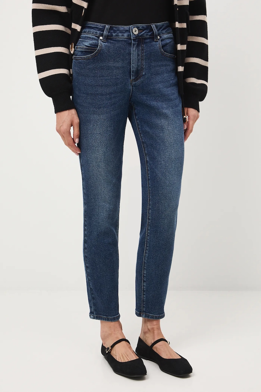 - Fason slim - jeansy o dopasowanym kroju z wąską nogawką, zarówno w okolicach ud, jak i kostki. Podkreślają naturalną linię sylwetki, lecz jej nie opinają - są komfortowe w codziennym użytkowaniu. - Model z podwyższoną talią i zapięciem na guzik i suwak. - Wsuwane kieszenie. - Ozdobnie sprany denim. - Szerokość w pasie: 34 cm. - Szerokość w biodrach: 45 cm. - Wysokość stanu: 25 cm. - Szerokość nogawki na dole: 15 cm. - Długość wewnętrzna nogawki: 72 cm. - Wymiary podane dla rozmiaru: 36.