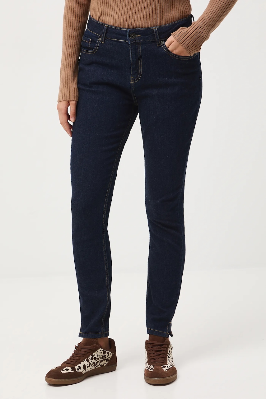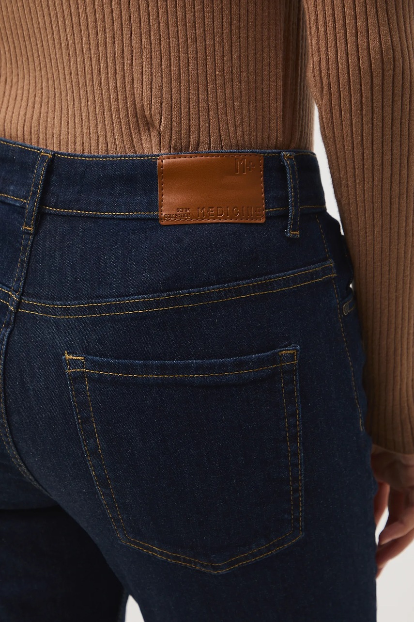 - Fason slim - jeansy o dopasowanym kroju z wąską nogawką, zarówno w okolicach ud, jak i kostki. Podkreślają naturalną linię sylwetki, lecz jej nie opinają - są komfortowe w codziennym użytkowaniu. - Model z podwyższoną talią i zapięciem na guzik i suwak. - Wsuwane kieszenie. - Gładki materiał. - Szerokość w pasie: 35 cm. - Szerokość w biodrach: 47 cm. - Wysokość stanu: 25,5 cm. - Szerokość nogawki na dole: 12,5 cm. - Długość wewnętrzna nogawki: 72 cm. - Wymiary podane dla rozmiaru: 36.
