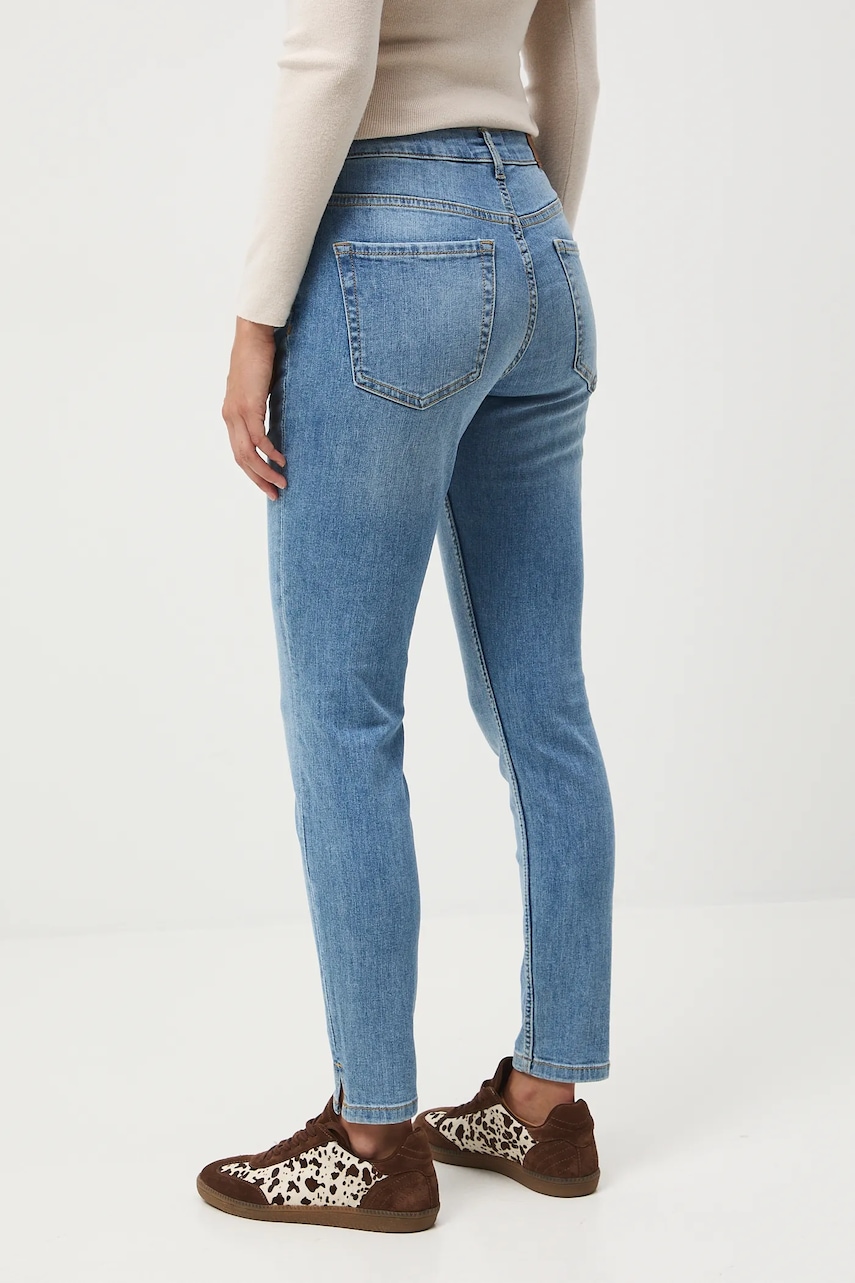 - Fason slim - jeansy o dopasowanym kroju z wąską nogawką, zarówno w okolicach ud, jak i kostki. Podkreślają naturalną linię sylwetki, lecz jej nie opinają - są komfortowe w codziennym użytkowaniu. - Model z podwyższoną talią i zapięciem na guzik i suwak. - Wsuwane kieszenie. - Ozdobnie sprany denim. - Szerokość w pasie: 35 cm. - Szerokość w biodrach: 47 cm. - Wysokość stanu: 25,5 cm. - Szerokość nogawki na dole: 12,5 cm. - Długość wewnętrzna nogawki: 72 cm. - Wymiary podane dla rozmiaru: 36.