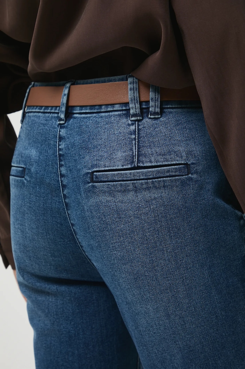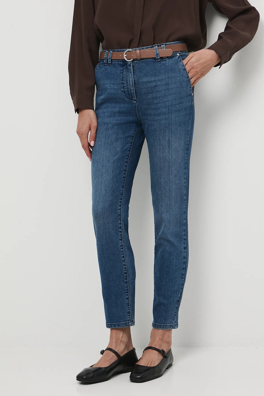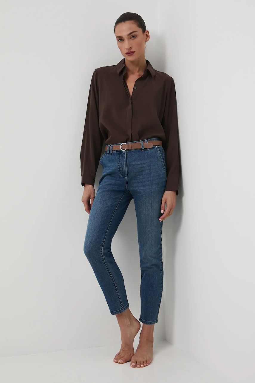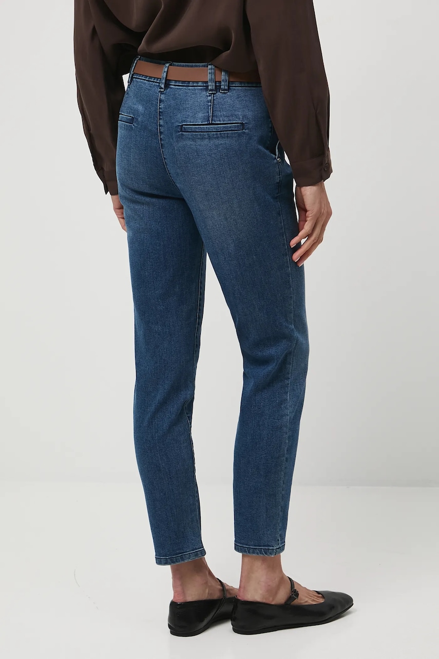 - Fason chino - jeansy charakteryzujące się skośnymi kieszeniami oraz prostą nogawką delikatnie zwężaną ku dołowi. Mają zwykle kieszenie z przodu i z tyłu, co nadaje im swobodny, ale jednocześnie praktyczny wygląd. Są luźniejsze w okolicach bioder, odpowiednie zarówno dla wysokich, jak i niskich sylwetek, a dobrze dobrane pomogą wyrównać proporcje w budowie ciała. - Model z regularną talią i zapięciem na guzik i suwak. - Dołączony pasek. - Ozdobnie sprany denim. - Szerokość w pasie: 37,5 cm. - Szerokość w biodrach: 47 cm. - Wysokość stanu: 25,5 cm. - Szerokość nogawki na dole: 15 cm. - Długość wewnętrzna nogawki: 71 cm. - Wymiary podane dla rozmiaru: 36.