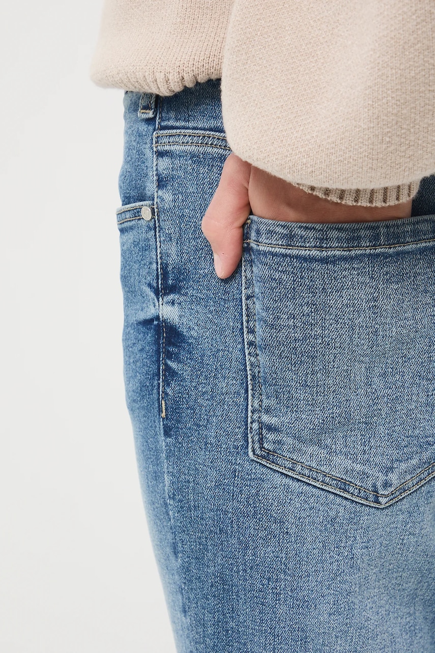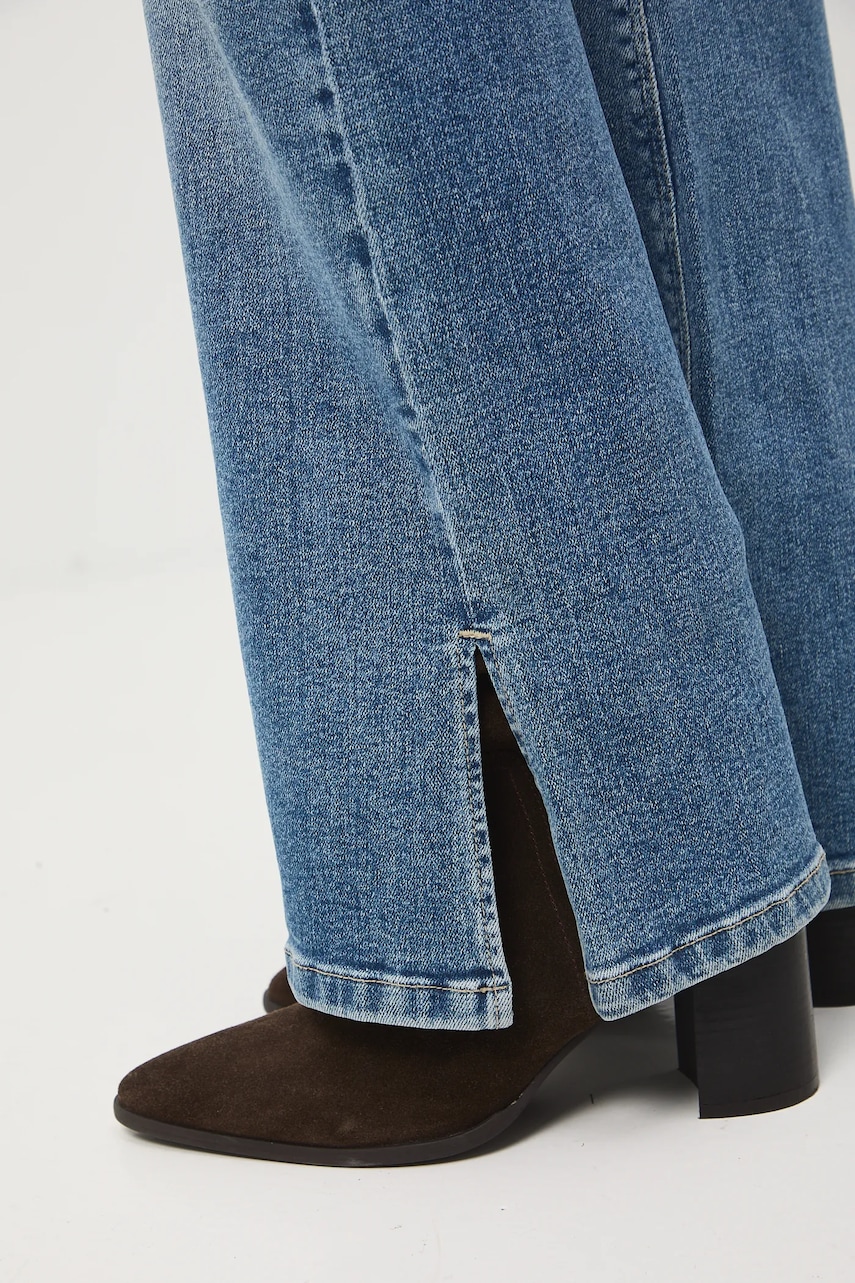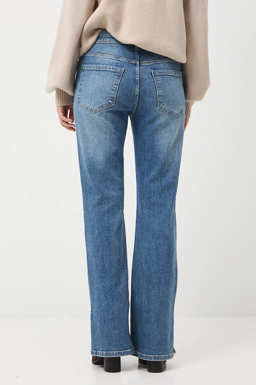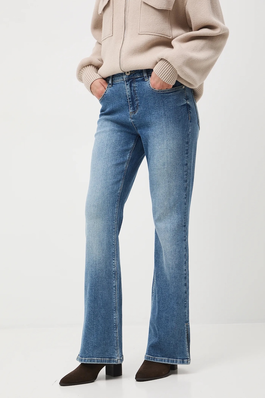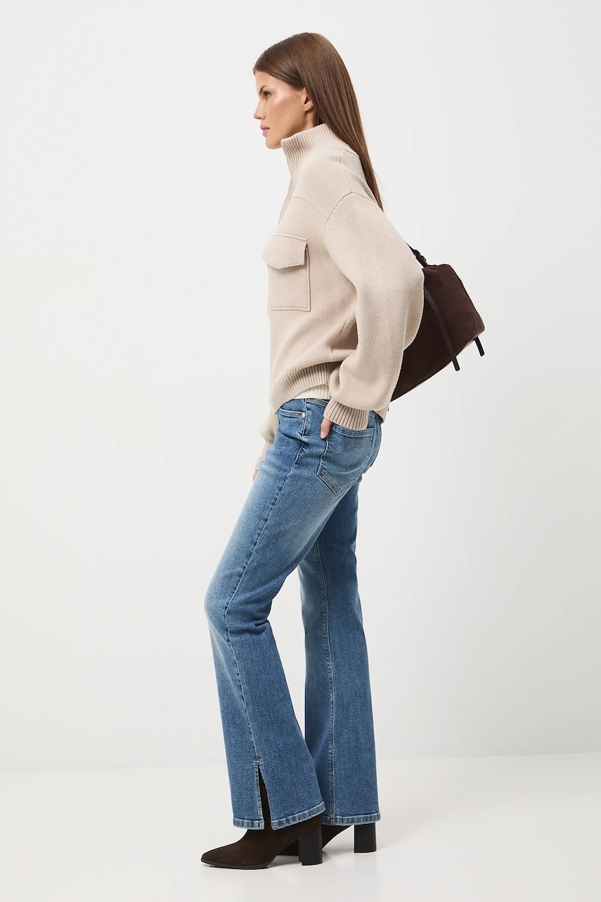 - Fason flare - jeansy dopasowane w okolicach talii oraz bioder. Wyróżnia je charakterystyczna nogawka, która rozszerza się stopniowo dopiero od okolic kolan. Krój tworzy efekt klepsydry i równoważy proporcje sylwetki. - Model z regularną talią i zapięciem na guzik i suwak. - Wsuwane kieszenie. - Rozcięcia u dołu nogawek. - Ozdobnie sprany denim. - Szerokość w pasie: 37 cm. - Szerokość w biodrach: 45 cm. - Wysokość stanu: 25 cm. - Szerokość nogawki na dole: 24 cm. - Długość wewnętrzna nogawki: 81 cm. - Wymiary podane dla rozmiaru: 36.