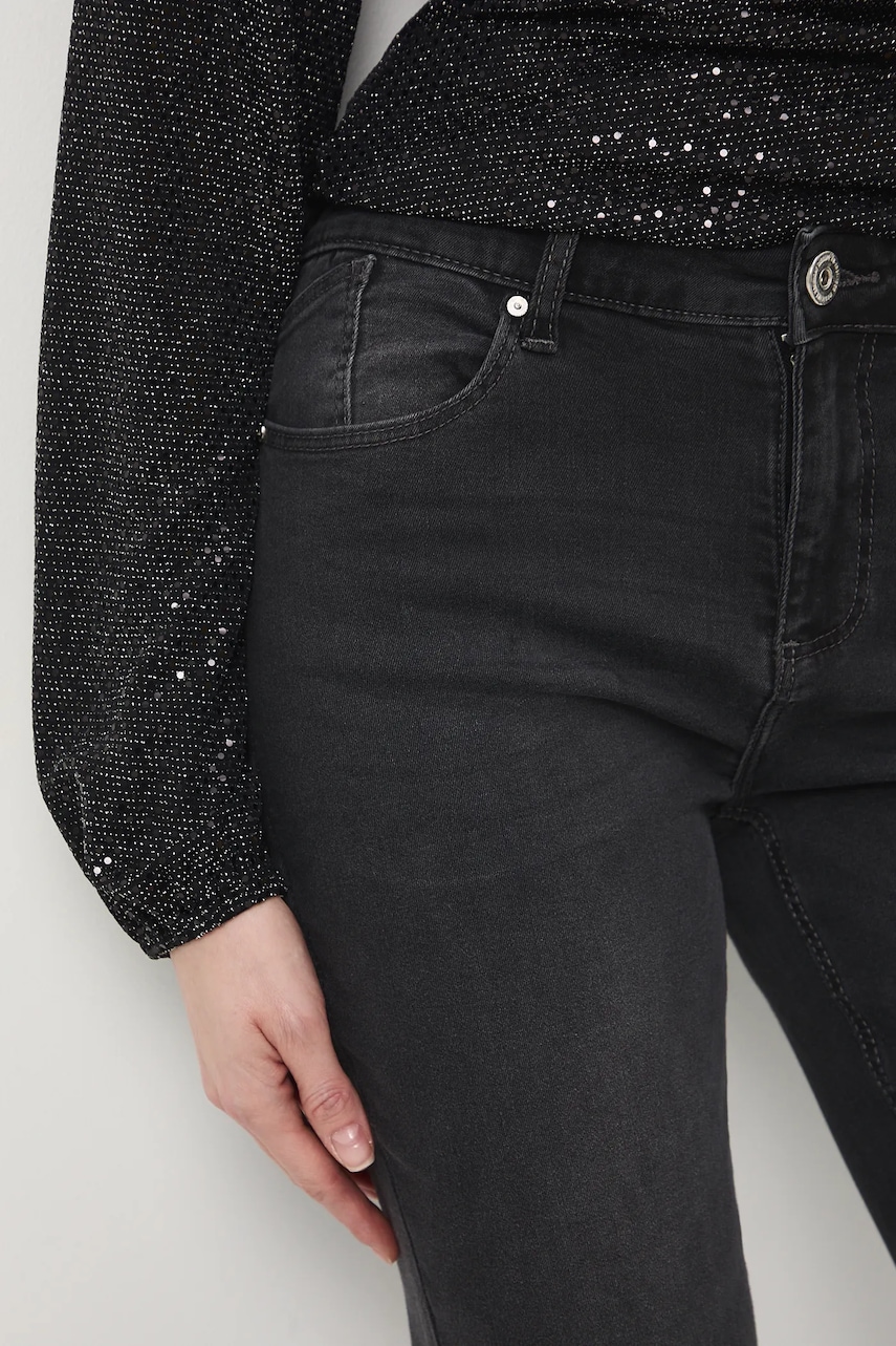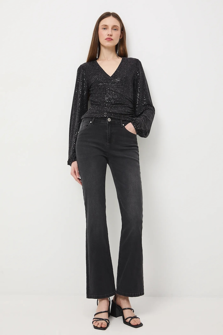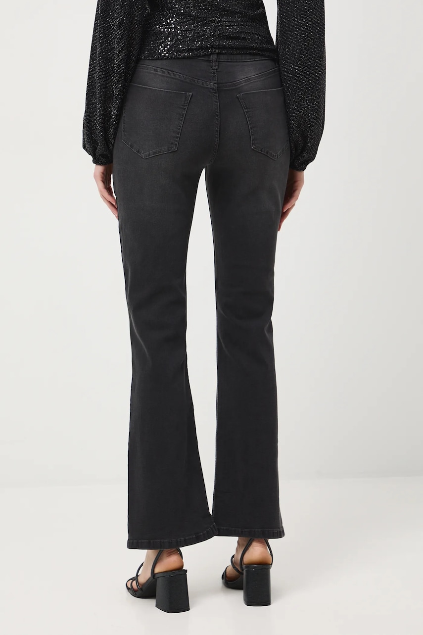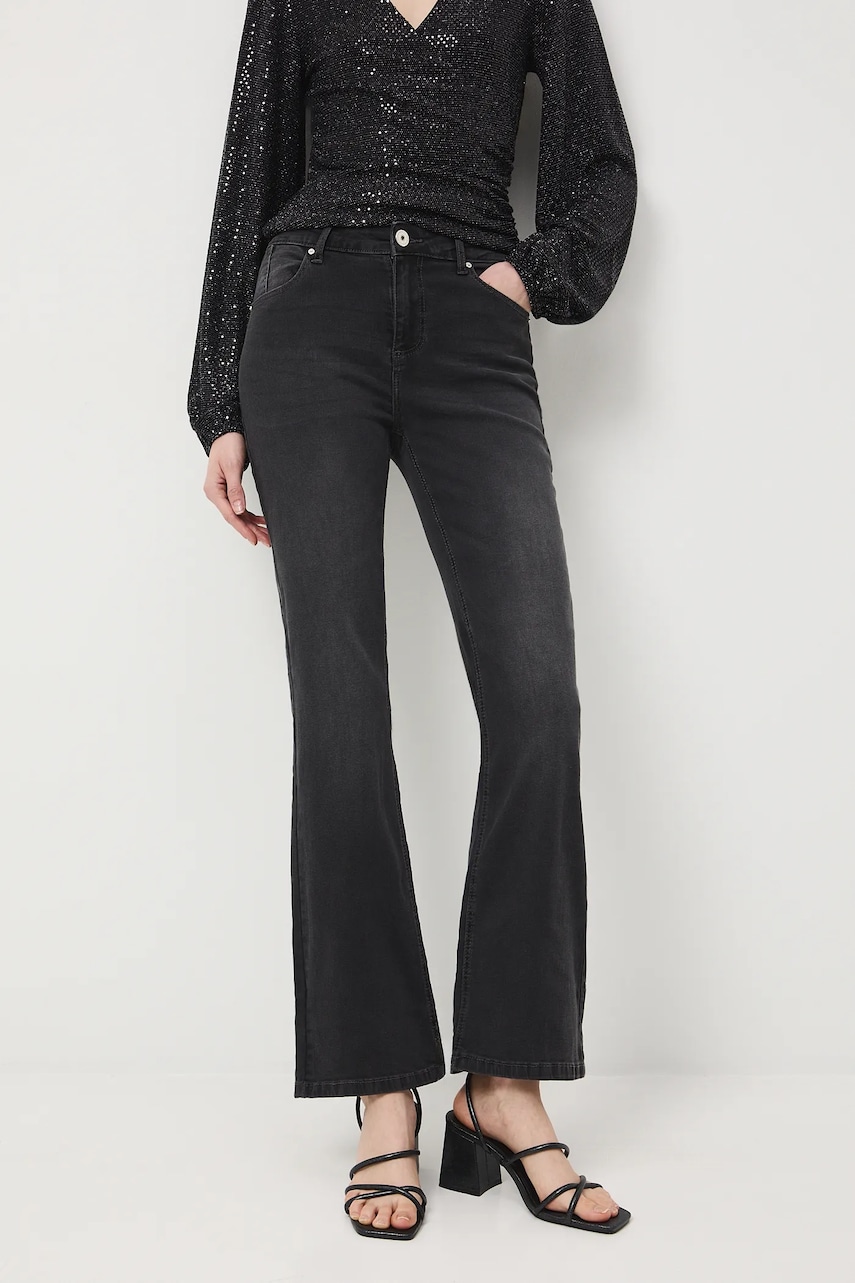 - Fason flare - jeansy dopasowane w okolicach talii oraz bioder. Wyróżnia je charakterystyczna nogawka, która rozszerza się stopniowo dopiero od okolic kolan. Krój tworzy efekt klepsydry i równoważy proporcje sylwetki. - Model z regularną talią i zapięciem na guzik i suwak. - Wsuwane kieszenie. - Ozdobnie sprany denim. - Szerokość w pasie: 36 cm. - Szerokość w biodrach: 44,5 cm. - Wysokość stanu: 24,5 cm. - Szerokość nogawki na dole: 24 cm. - Długość wewnętrzna nogawki: 81 cm. - Wymiary podane dla rozmiaru: 36.