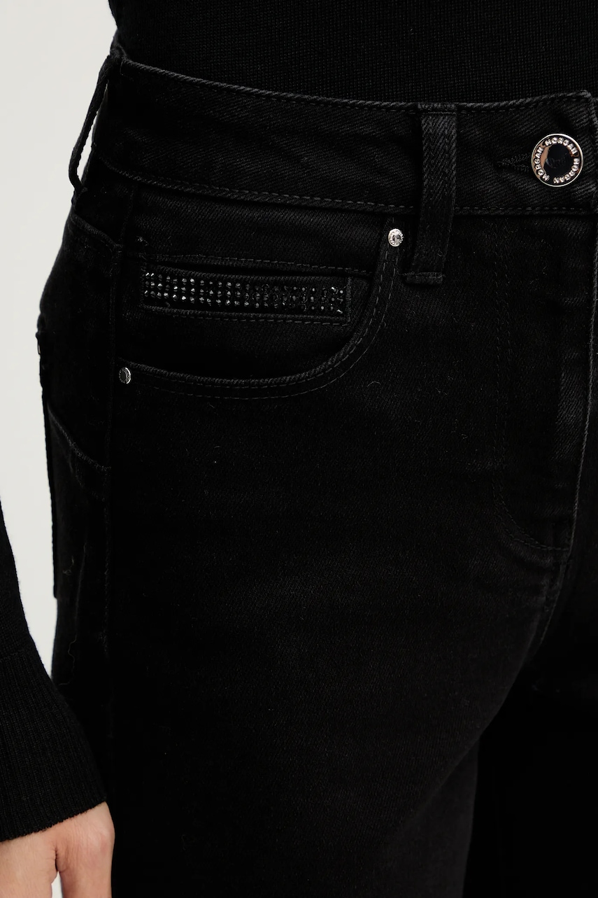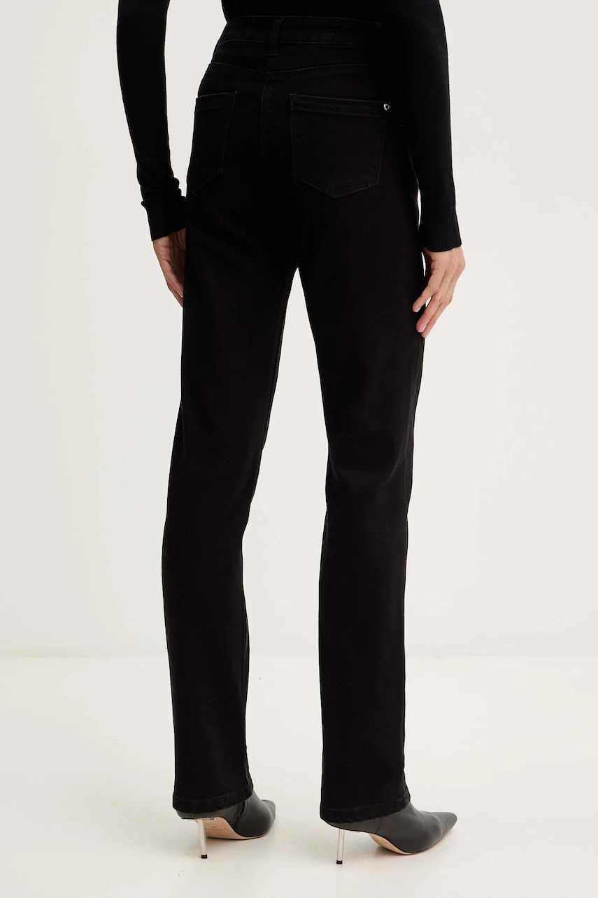 - Model z podwyższoną talią i zapięciem na guzik i suwak. - Z przodu trzy wsuwane kieszenie. - Dwie wsuwane kieszenie na pośladkach. - Szerokość w pasie: 34 cm. - Szerokość w biodrach: 42 cm. - Wysokość stanu: 27 cm. - Szerokość nogawki na dole: 19 cm. - Szerokość nogawki: 23 cm. - Długość wewnętrzna nogawki: 81 cm. - Wymiary podane dla rozmiaru: 36.