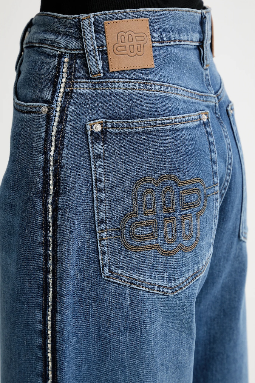 - Bawełna organiczna uprawiana jest bez użycia niebezpiecznych dla zdrowia substancji chemicznych, chemicznych środków szkodnikobójczych czy nawozów sztucznych. - Fason wide leg - jeansy lekko dopasowane w okolicy bioder z charakterystyczną szeroką nogawką, która stopniowo poszerza się od talii, aż do samego dołu. Krój akcentuje wcięcie w talii, a luźny dół nie krępuje ruchów. - Model z podwyższoną talią i zapięciem na guzik i suwak. - Z przodu trzy wsuwane kieszenie. - Dwie wsuwane kieszenie na pośladkach. - Szerokość w pasie: 36,5 cm. - Szerokość w biodrach: 51,5 cm. - Wysokość stanu: 33 cm. - Szerokość nogawki na dole: 32 cm. - Szerokość nogawki: 30,5 cm. - Długość zewnętrzna nogawki: 109 cm. - Wymiary podane dla rozmiaru: 36.