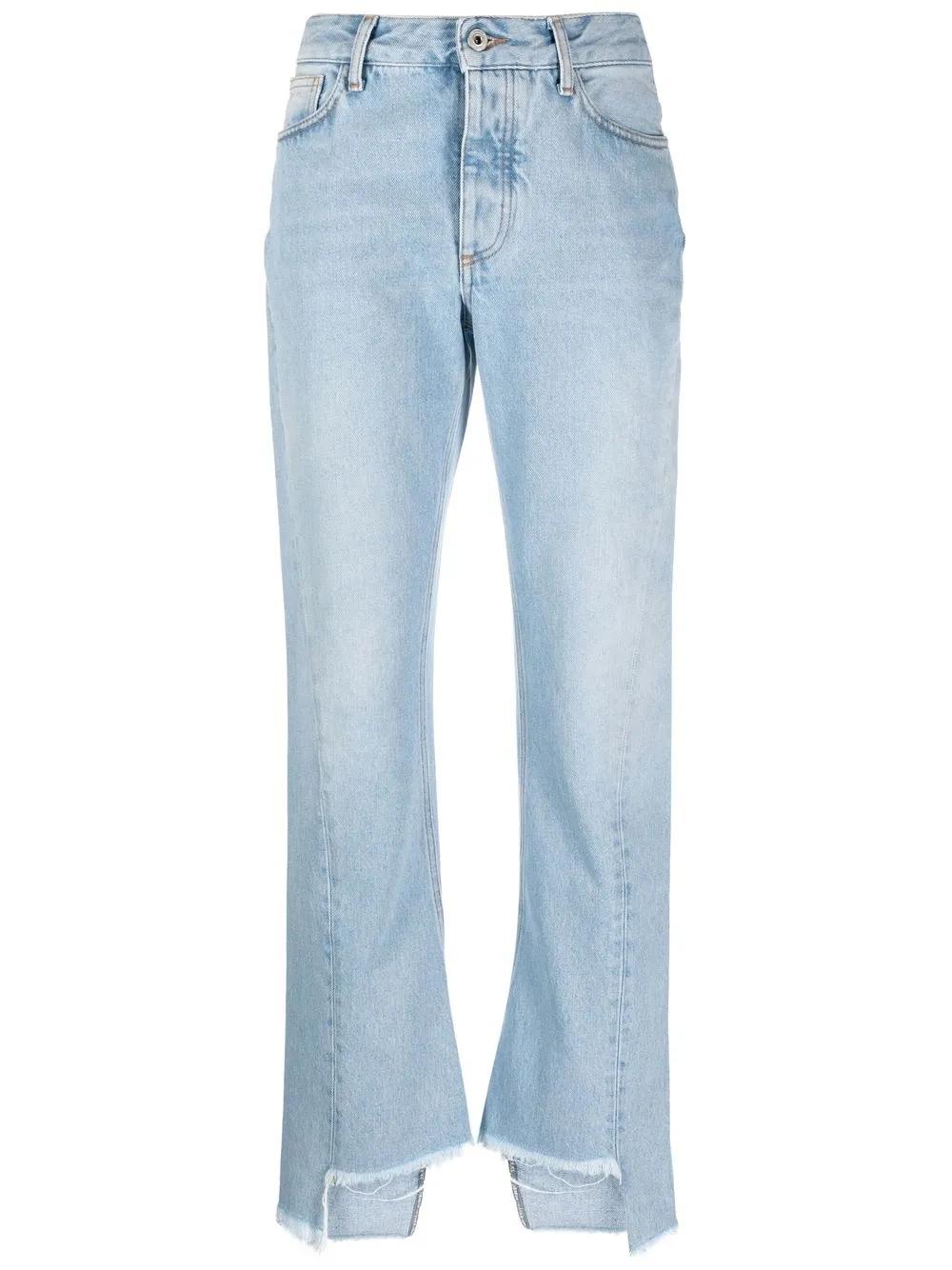 light blue cotton belt loops button fly fastening classic five pockets logo patch to the rear frayed edge straight leg
