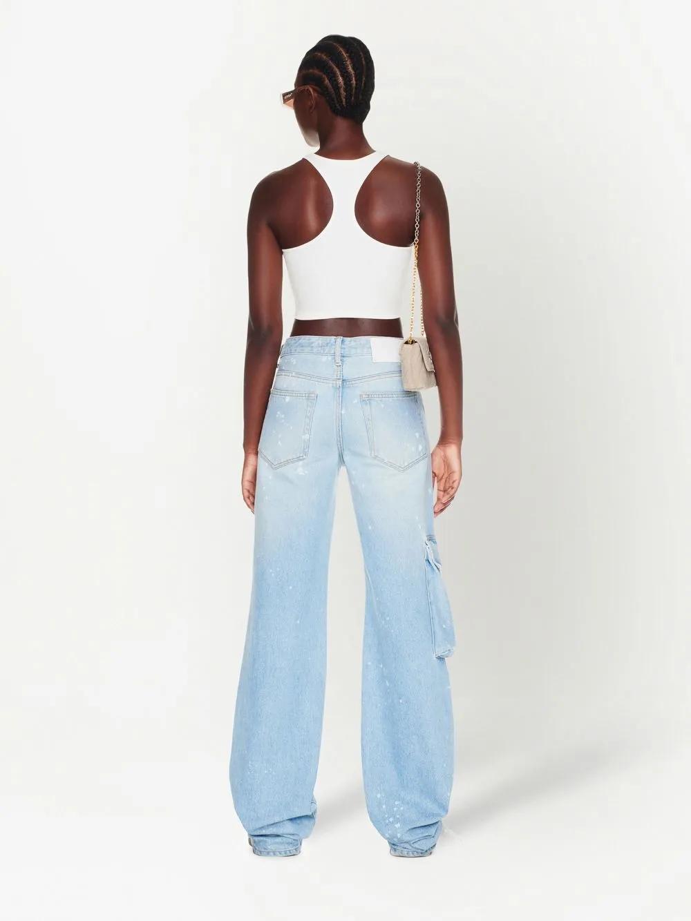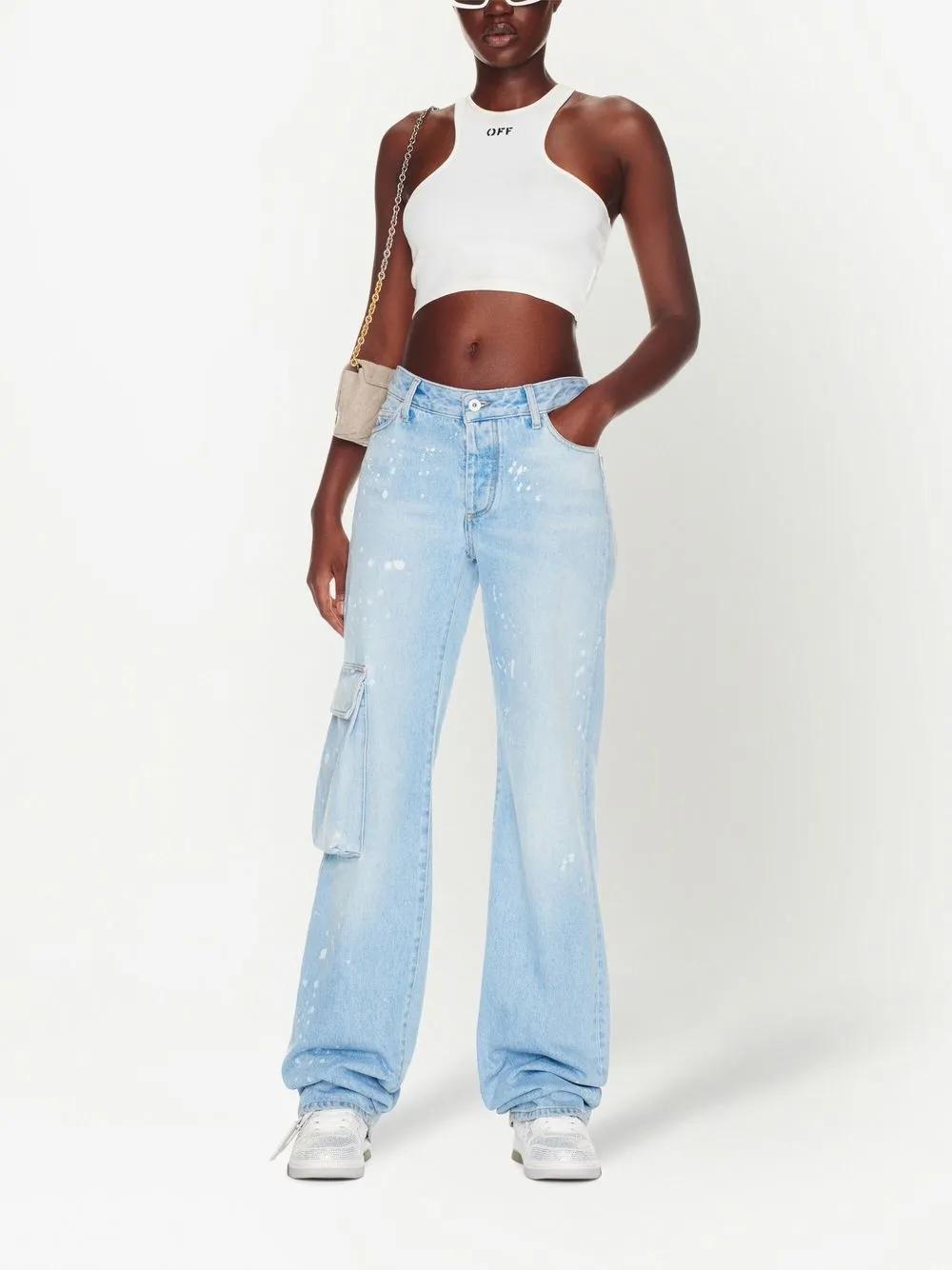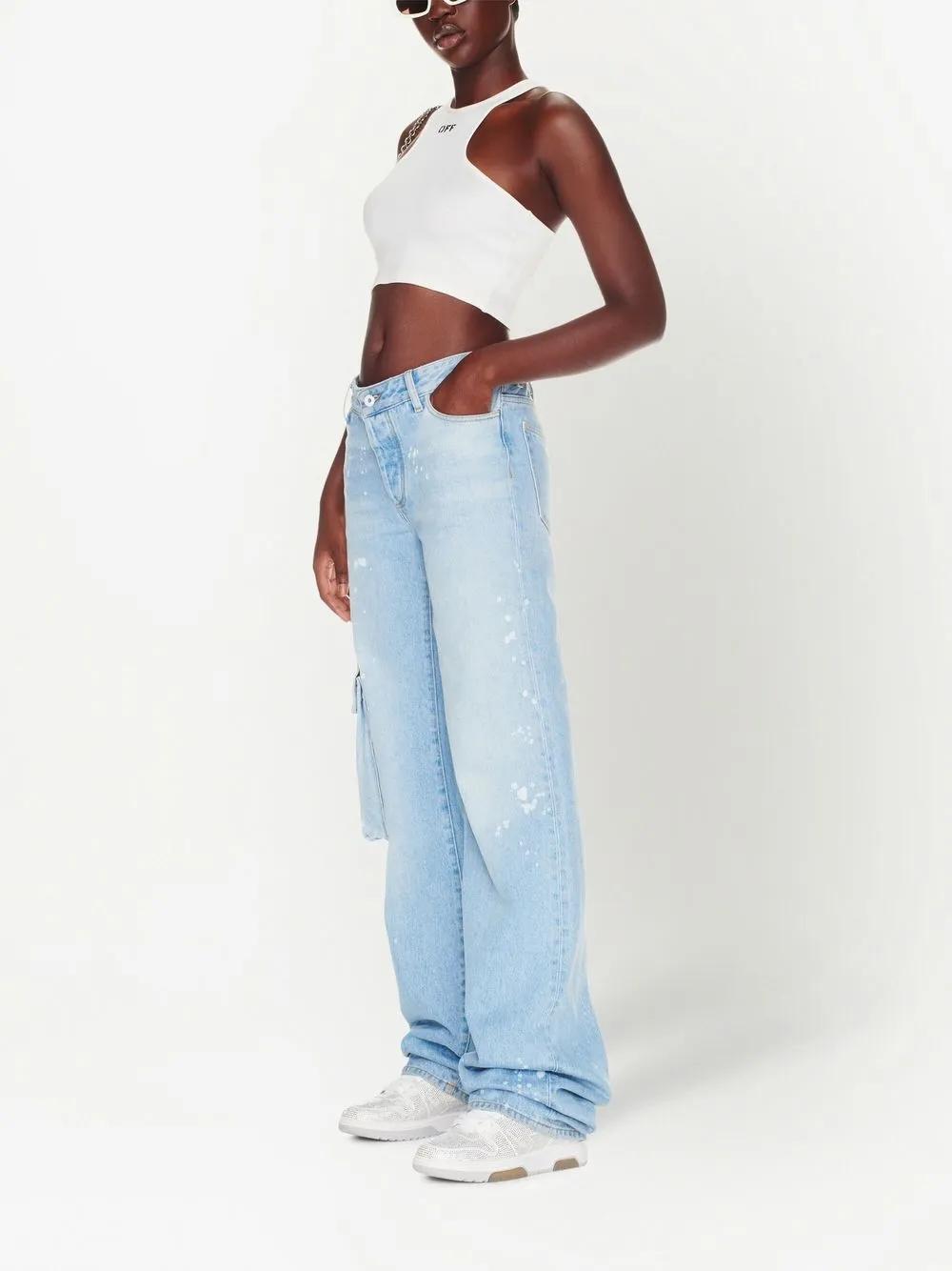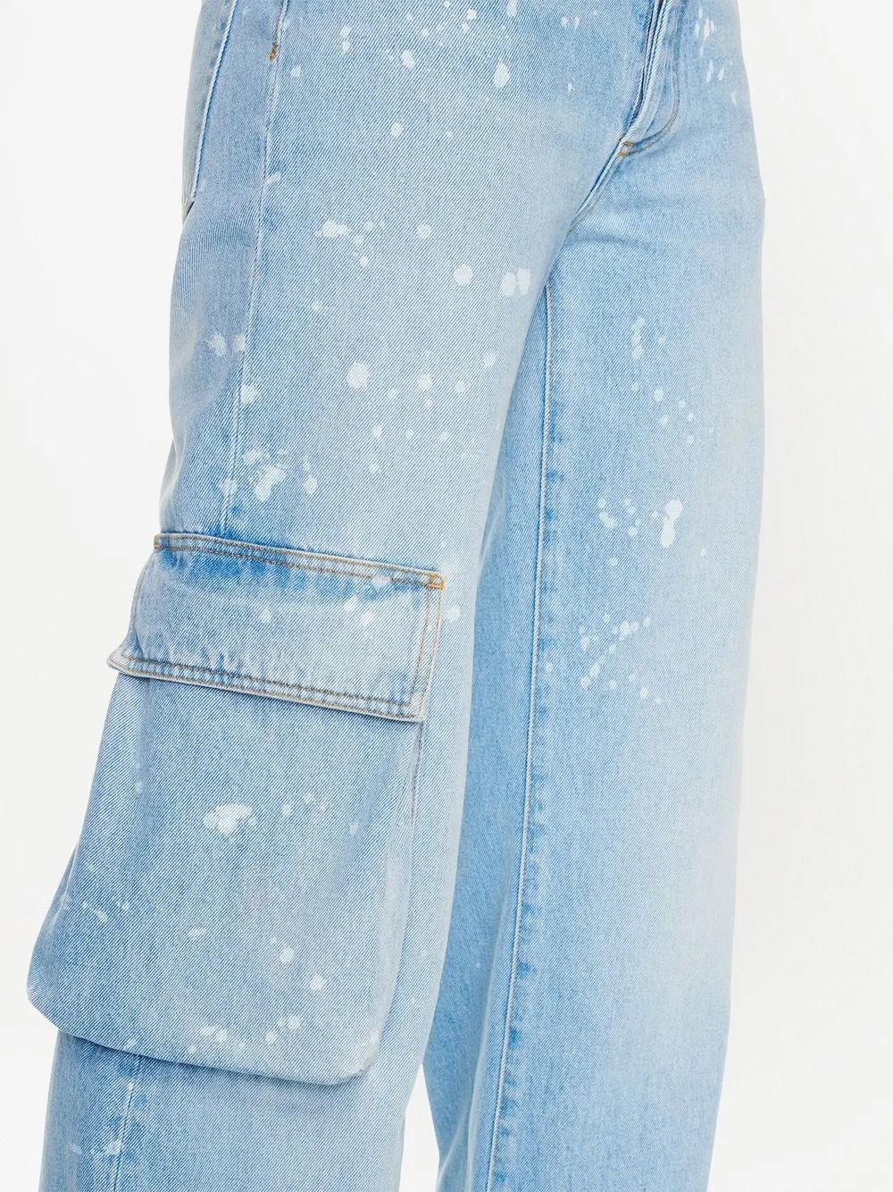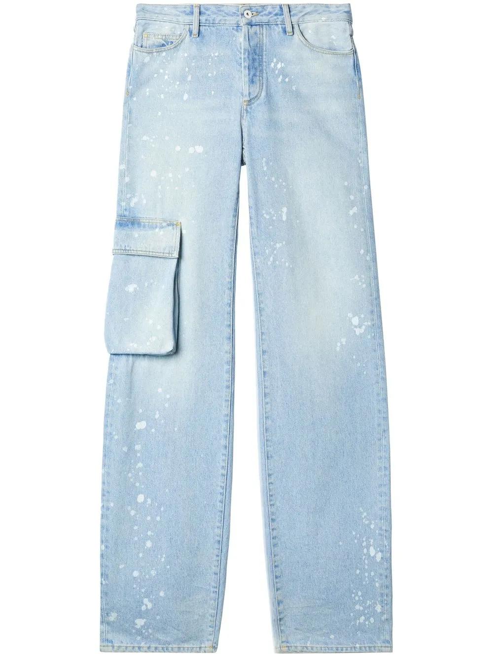 light blue cotton faded effect paint splatter detail logo patch to the rear belt loops front button and zip fastening classic five pockets side patch pocket wide leg