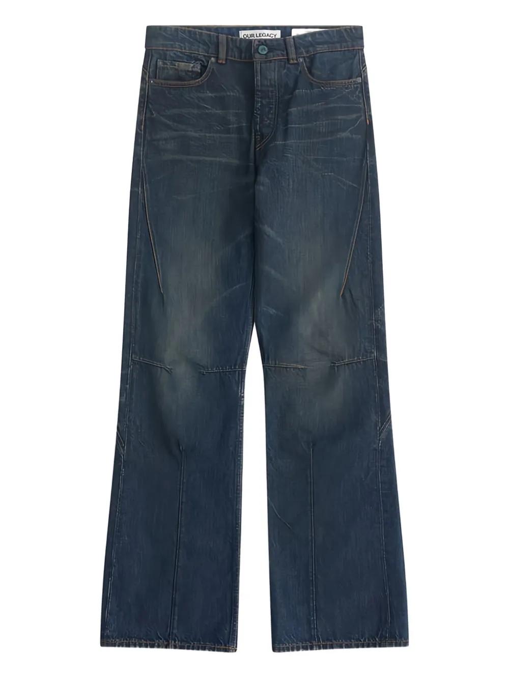 blue panelled design back patch pocket top button fastening belt loops cotton