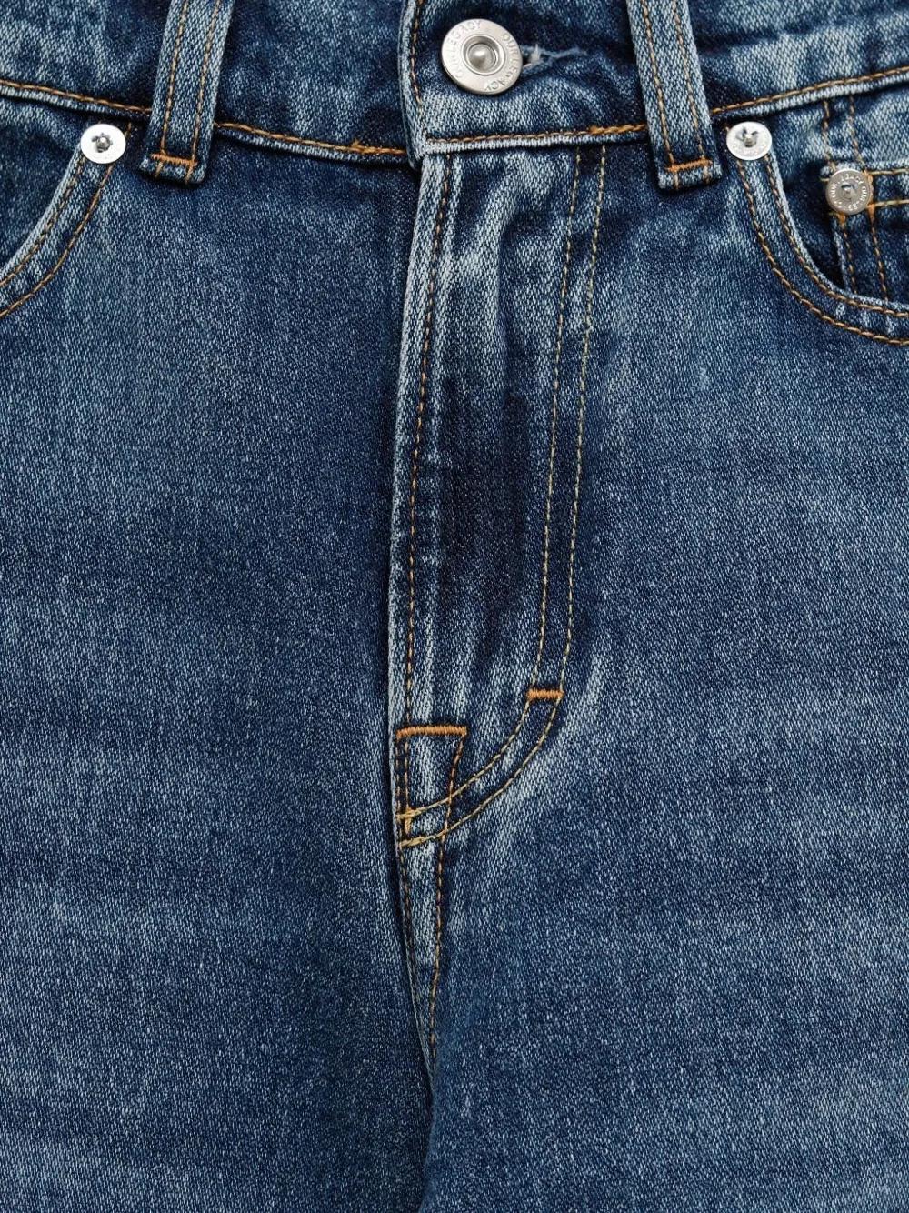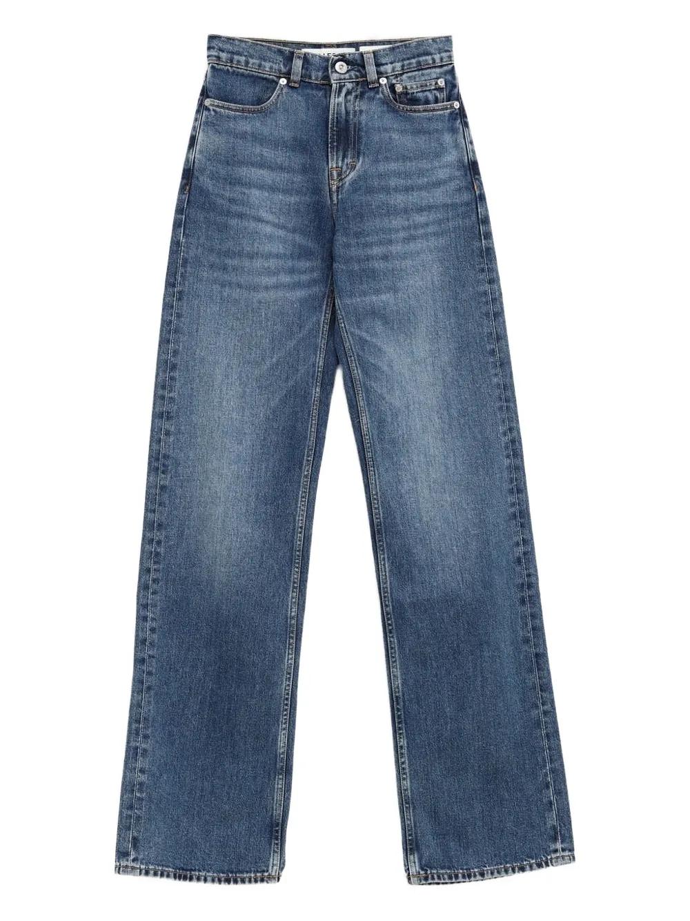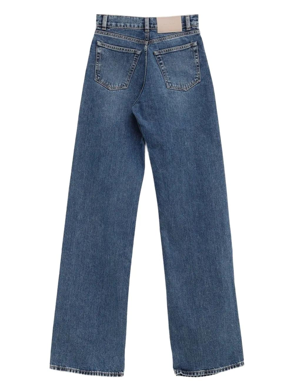 blue front button and zip fastening classic five pockets belt loops rear logo patch wide-leg