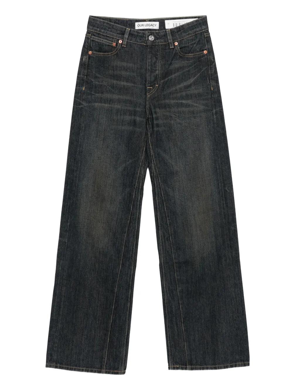 midnight blue belt loops classic five pockets rear logo patch top button closure