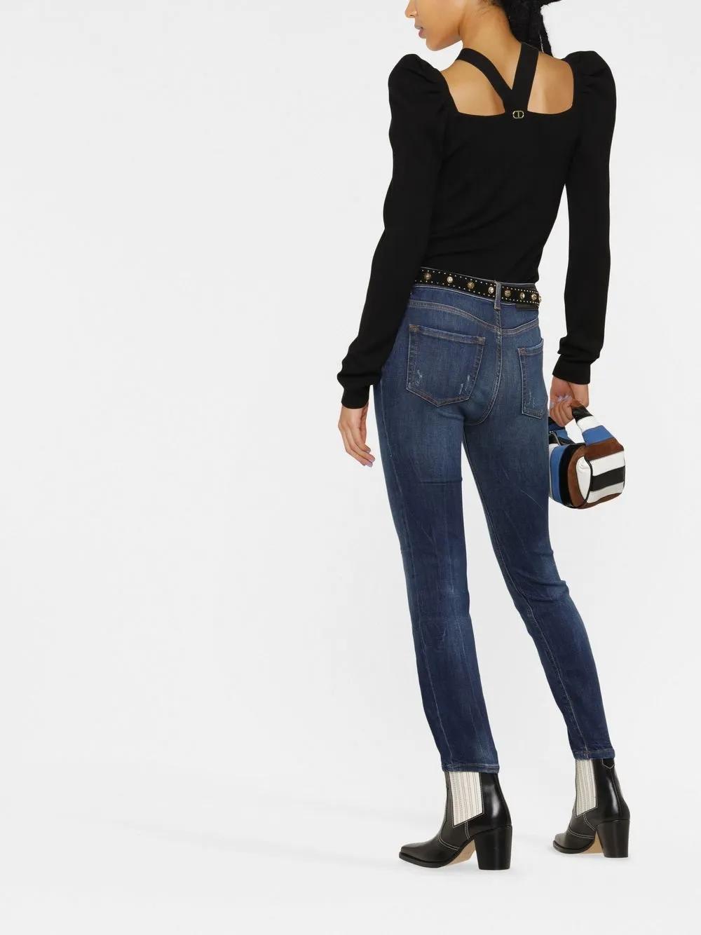 blue cotton low-rise distressed finish belt loops skinny cut
