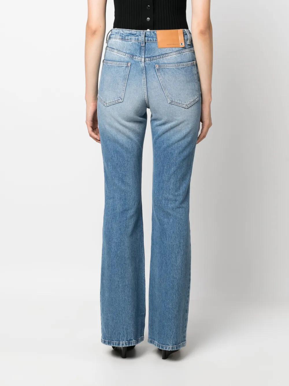 blue cotton denim silver-tone hardware coin detailing high-waisted logo patch to the rear belt loops front button and zip fastening flared classic five pockets