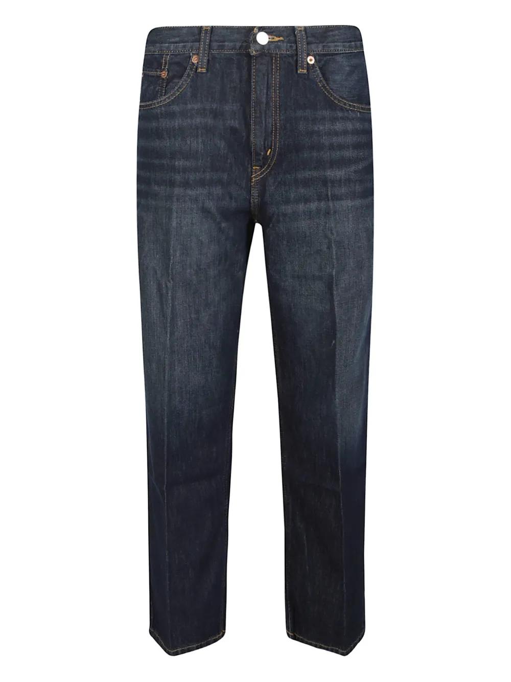 midnight blue belt loops classic five pockets rear logo patch top button closure