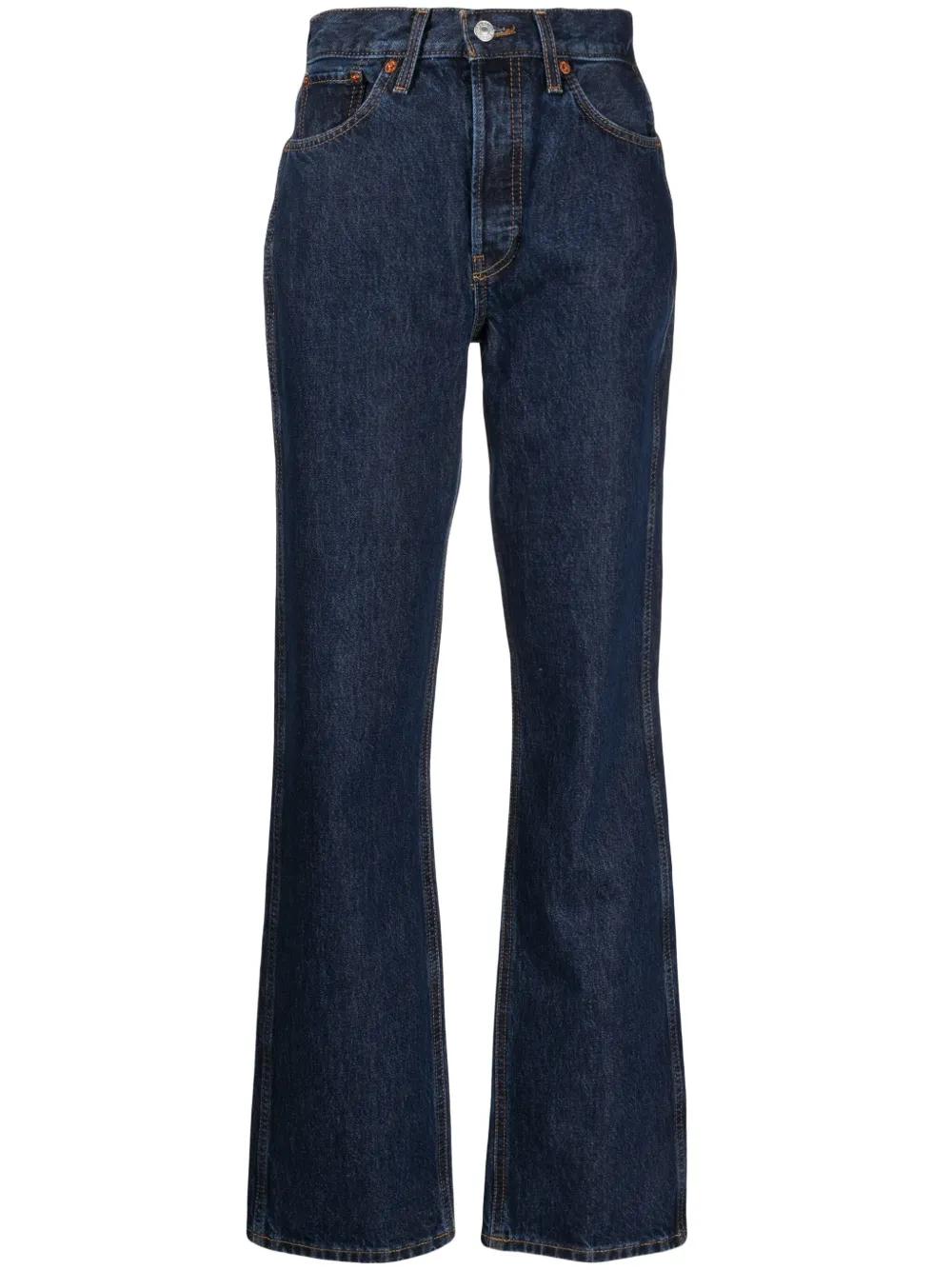 indigo blue organic cotton denim logo patch to the rear concealed fly and button fastening classic five pockets belt loops high rise wide leg straight hem