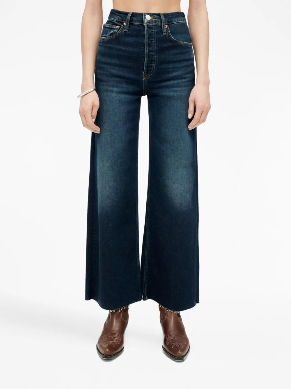 indigo blue cotton blend dark wash high waist wide leg front button and zip fastening classic five pockets