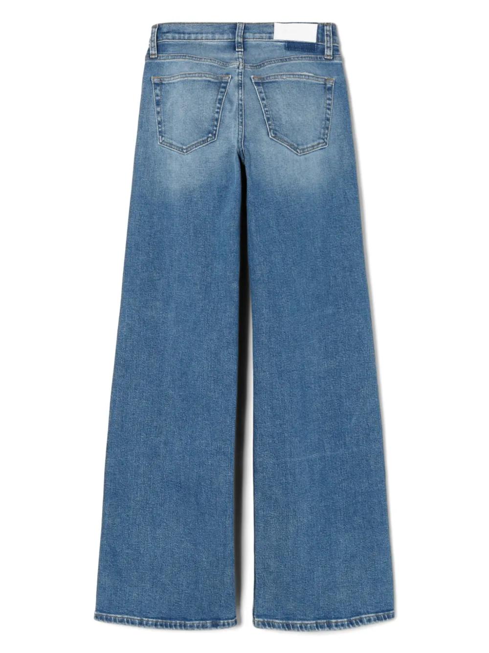 indigo blue cotton blend denim whiskering effect appliqué logo mid-rise belt loops classic five pockets concealed fly and button fastening wide leg