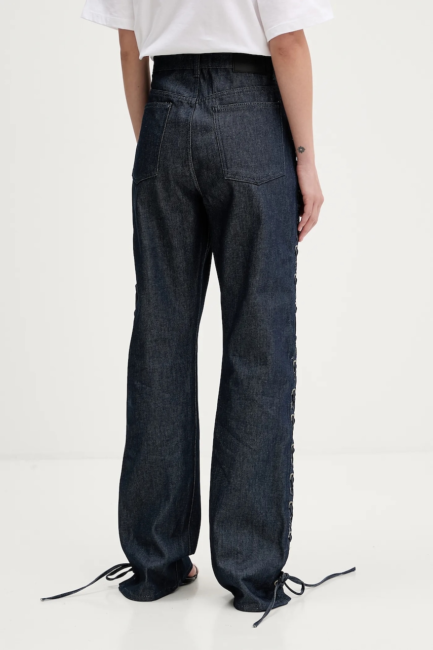 - Ten produkt został wykonany z bawełny organicznej. - Model z podwyższoną talią i zapięciem na guzik i suwak. - Z przodu trzy wsuwane kieszenie. - Dwie wsuwane kieszenie na pośladkach. - Po bokach ozdobne wiązania. - Szerokość w pasie: 39 cm. - Szerokość w biodrach: 50 cm. - Wysokość stanu: 31 cm. - Szerokość nogawki na dole: 23 cm. - Szerokość nogawki: 25 cm. - Długość wewnętrzna nogawki: 83 cm. - Wymiary podane dla rozmiaru: 30.