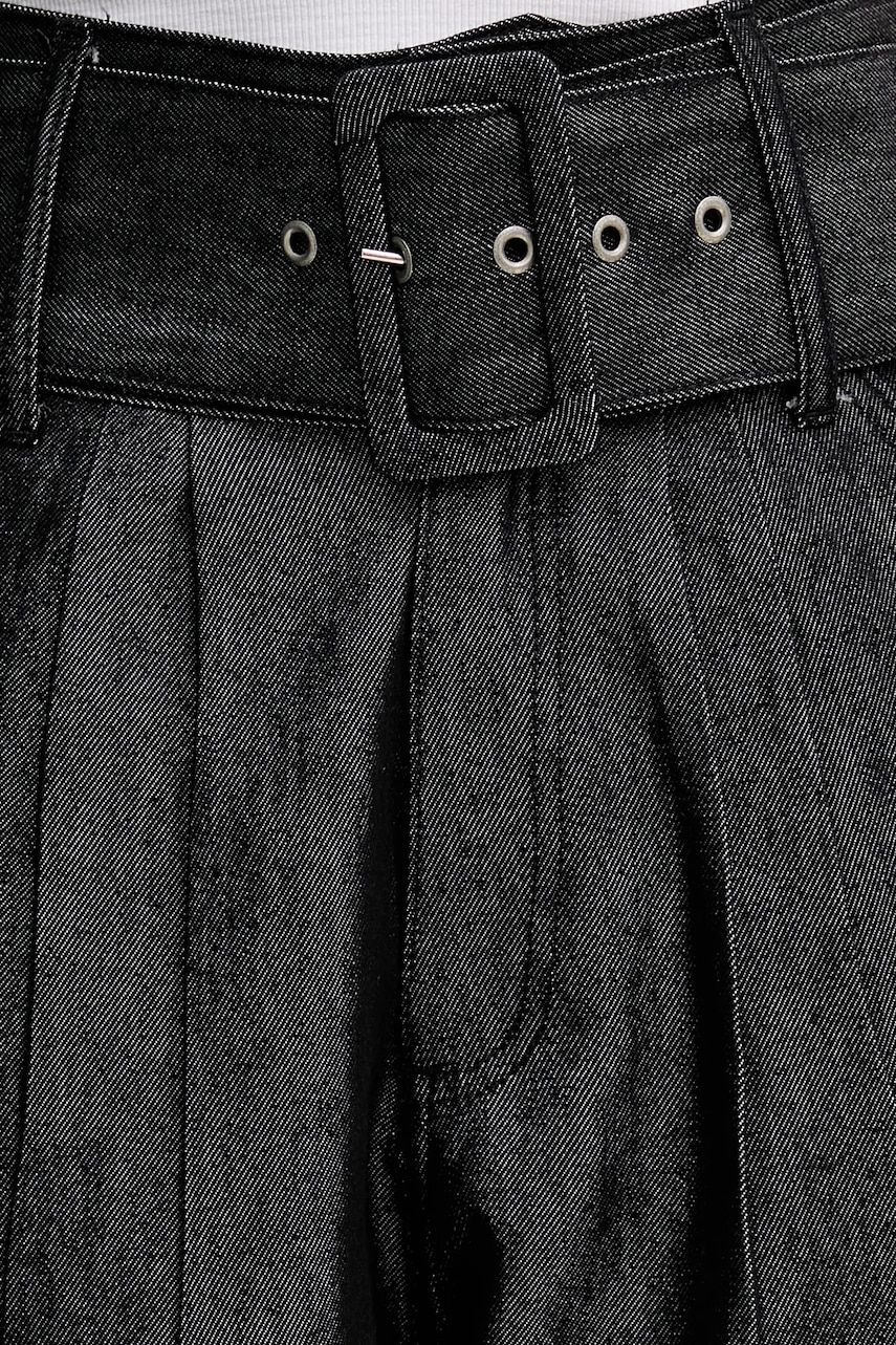 - Model z podwyższoną talią i zapięciem na suwak, guzik i haftki. - Dołączony tekstylny pasek. - Dwie wsuwane kieszenie boczne. - Szerokość w pasie: 35 cm. - Szerokość w biodrach: 44 cm. - Wysokość stanu: 40 cm. - Szerokość nogawki: 34 cm. - Szerokość nogawki na dole: 20 cm. - Długość wewnętrzna nogawki: 74 cm. - Wymiary podane dla rozmiaru: 36.