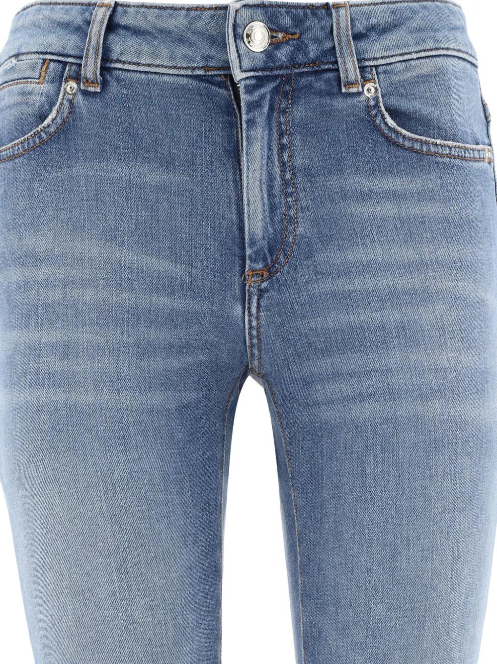 light blue five-pocket styling button fly belt loops contrast stitching