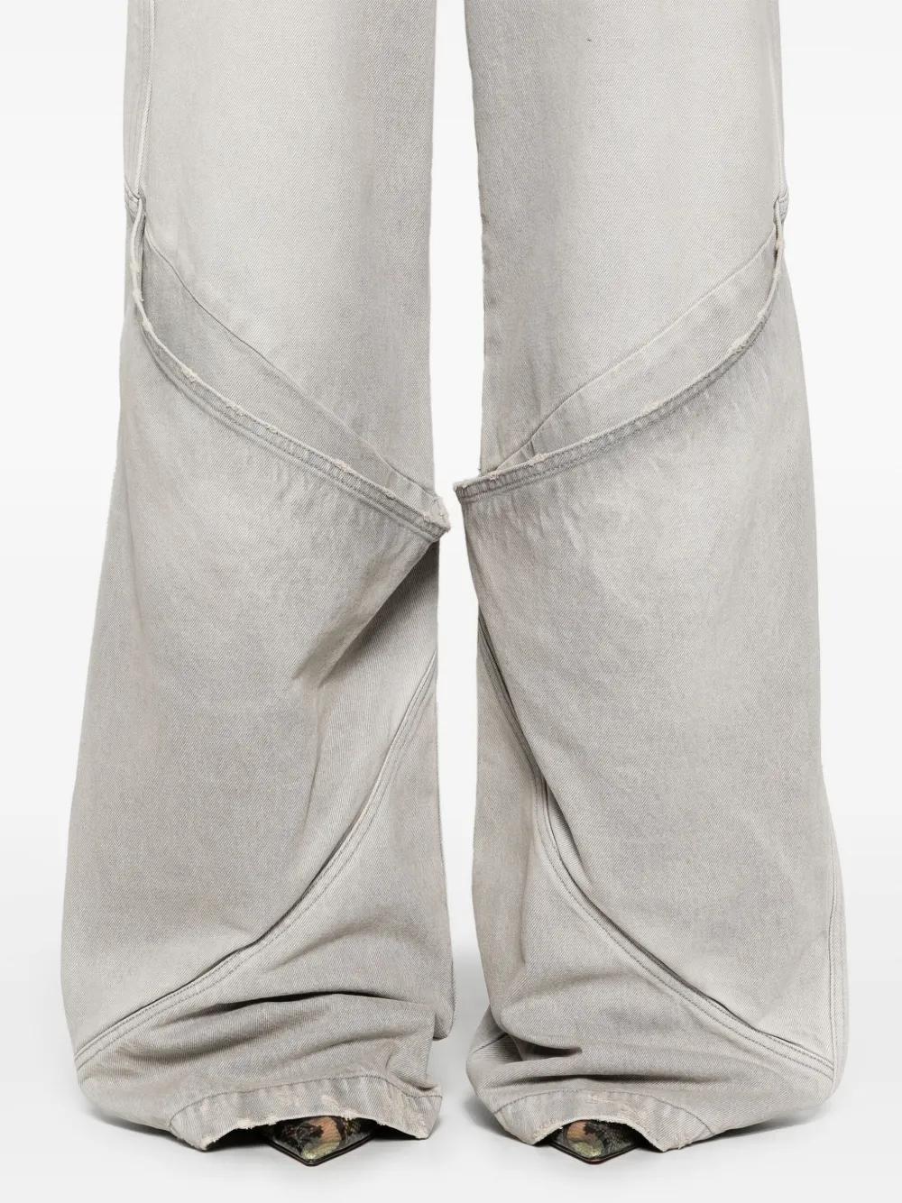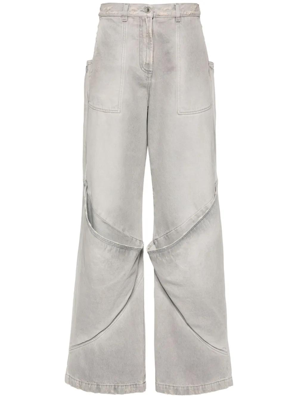 light grey cotton denim distressed effect slashed details dart detailing logo patch to the rear logo-embossed buttons wide leg high-rise concealed fly and button fastening belt loops two diagonal pockets to the sides two rear patch pockets straight hem