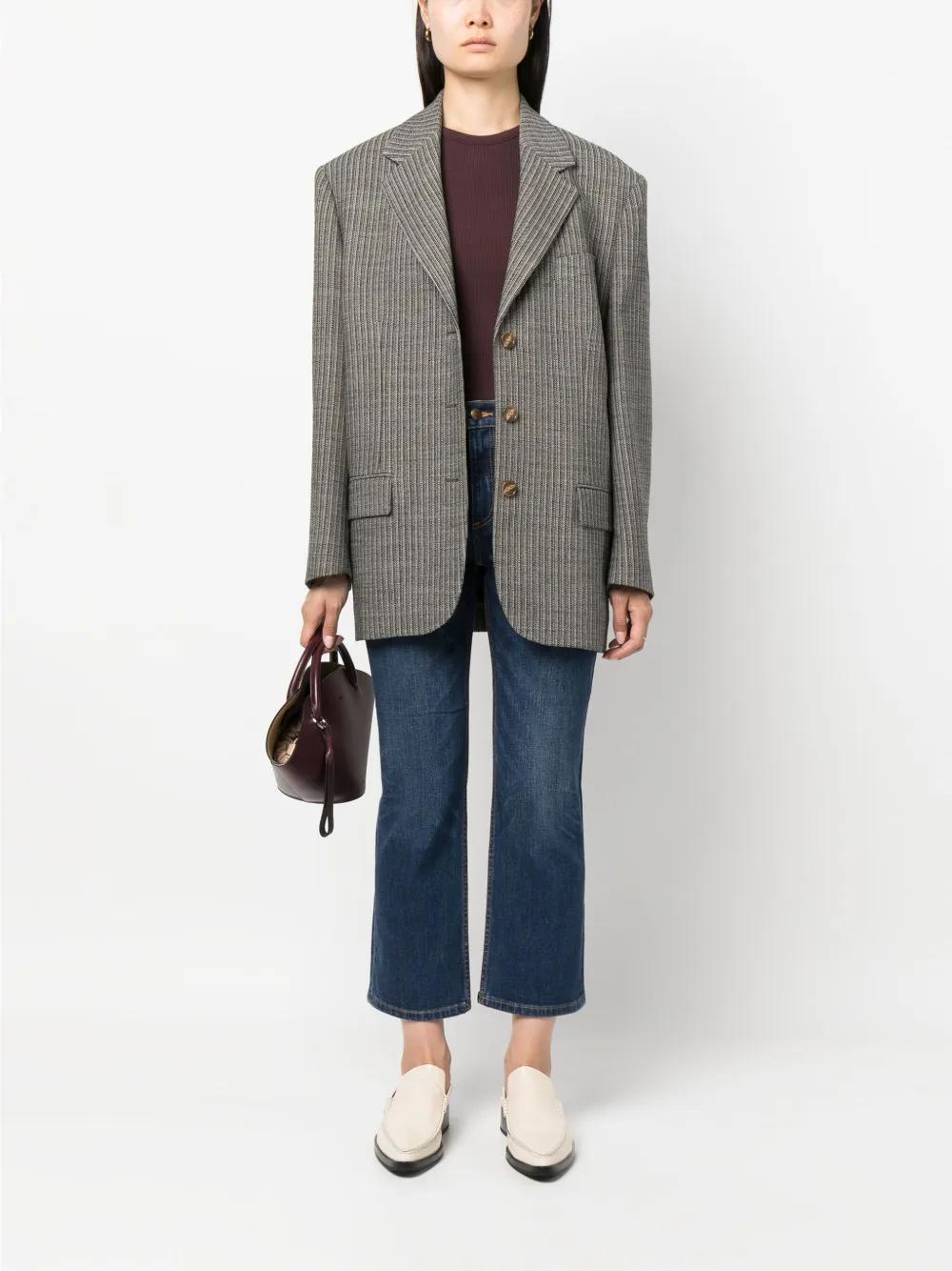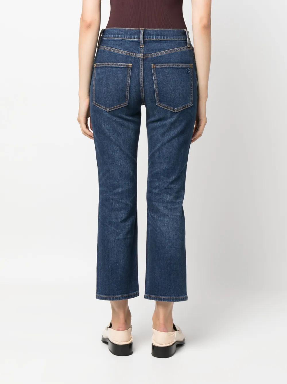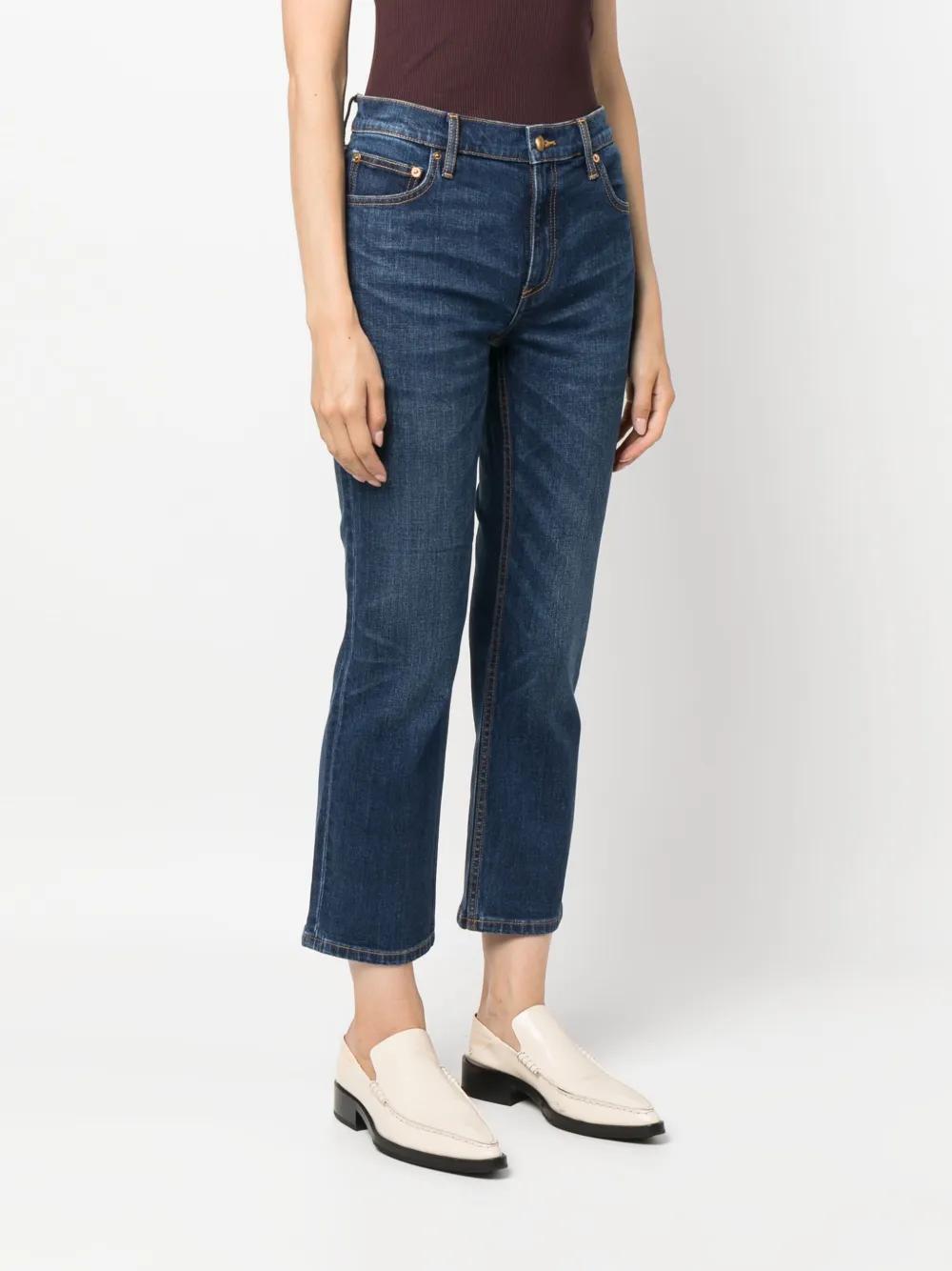 indigo blue stretch-cotton denim contrast stitching straight leg mid-rise concealed fly and button fastening belt loops classic five pockets cropped leg