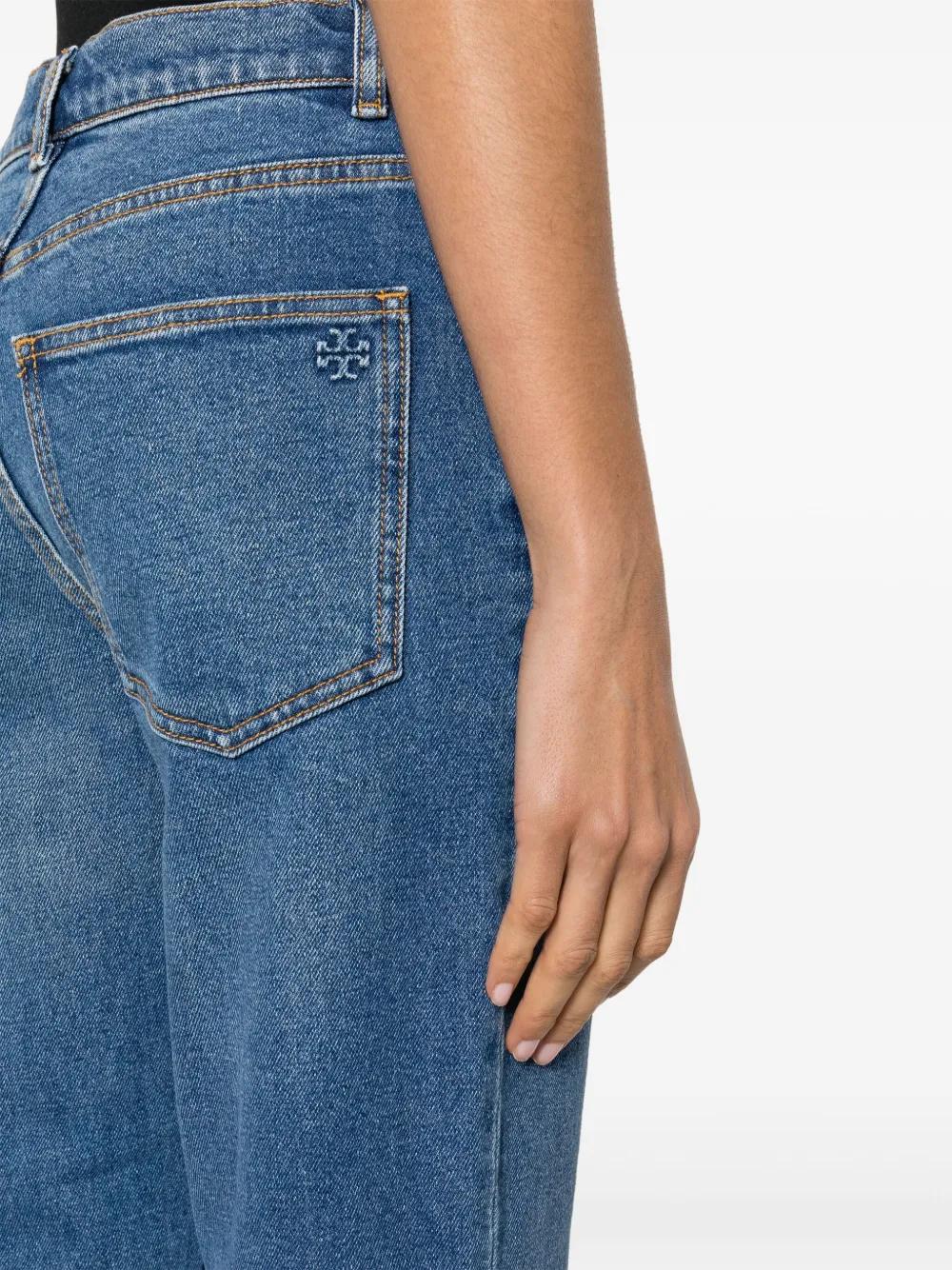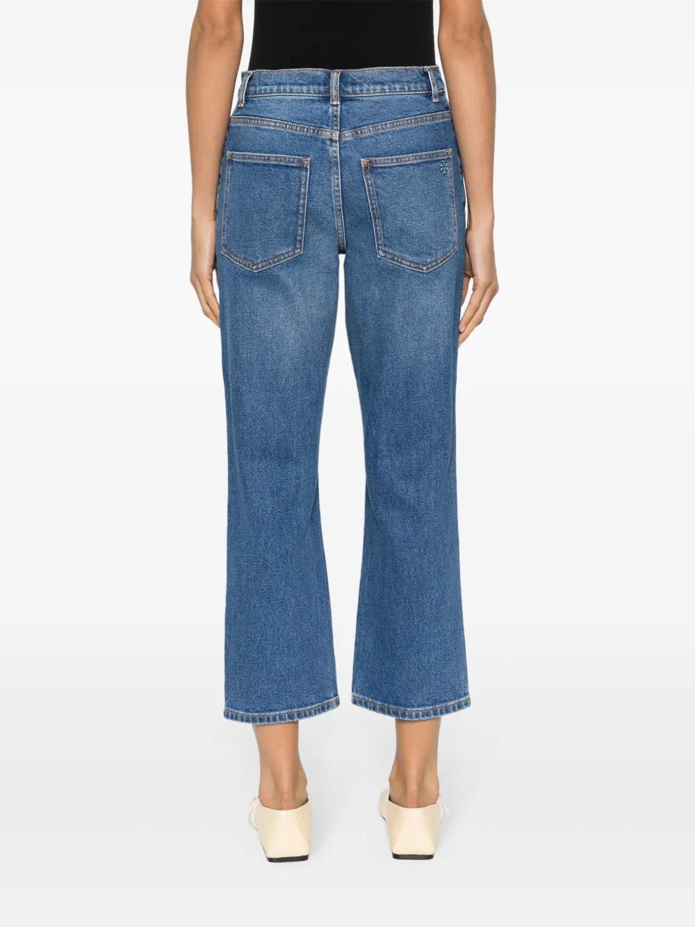 blue stretch-cotton denim gold-tone branded rivets belt loops classic five pocket design cropped flared design front button and zip fastening