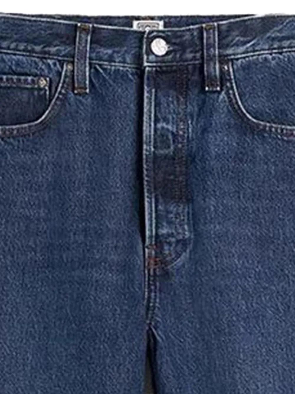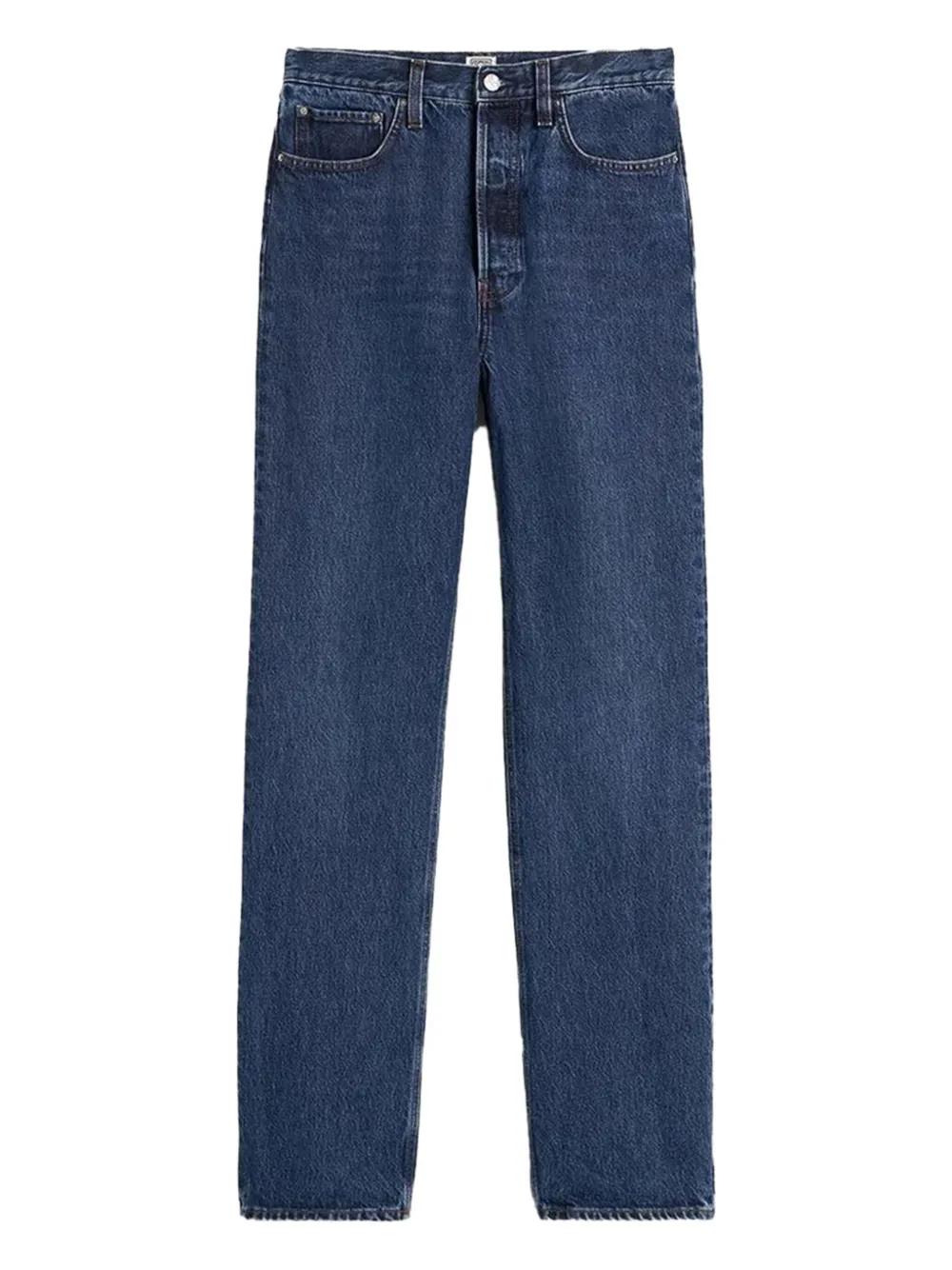 dark blue button fastening front pockets back pockets belt loops tonal stitching