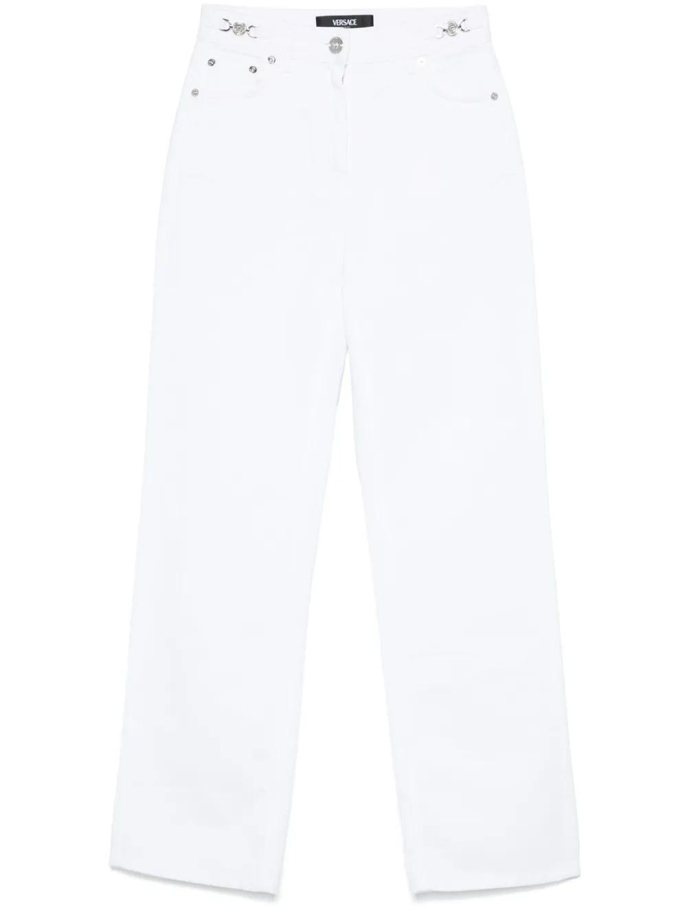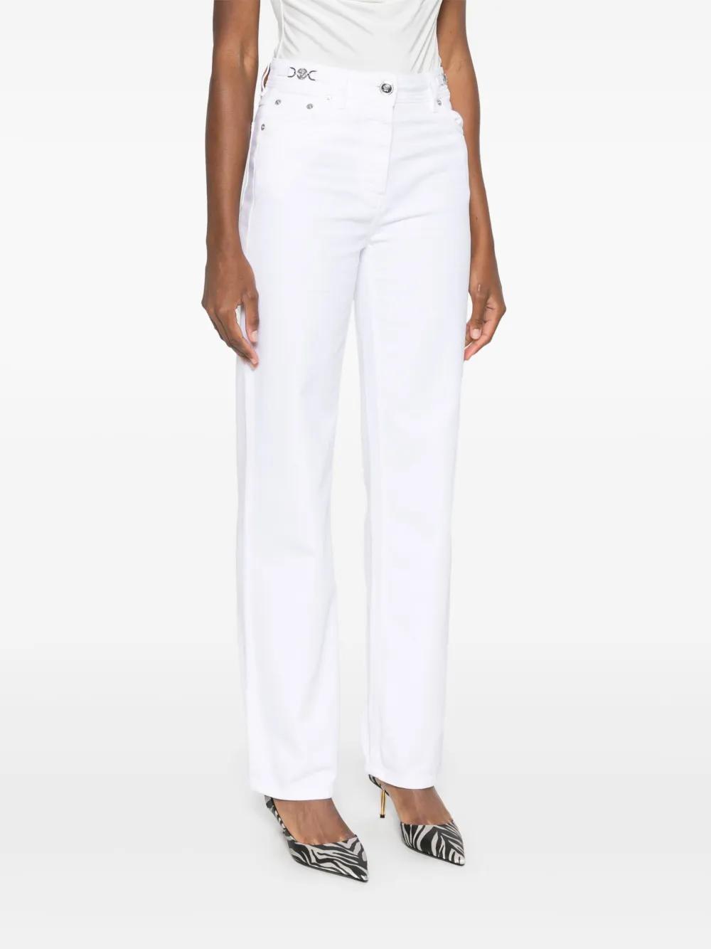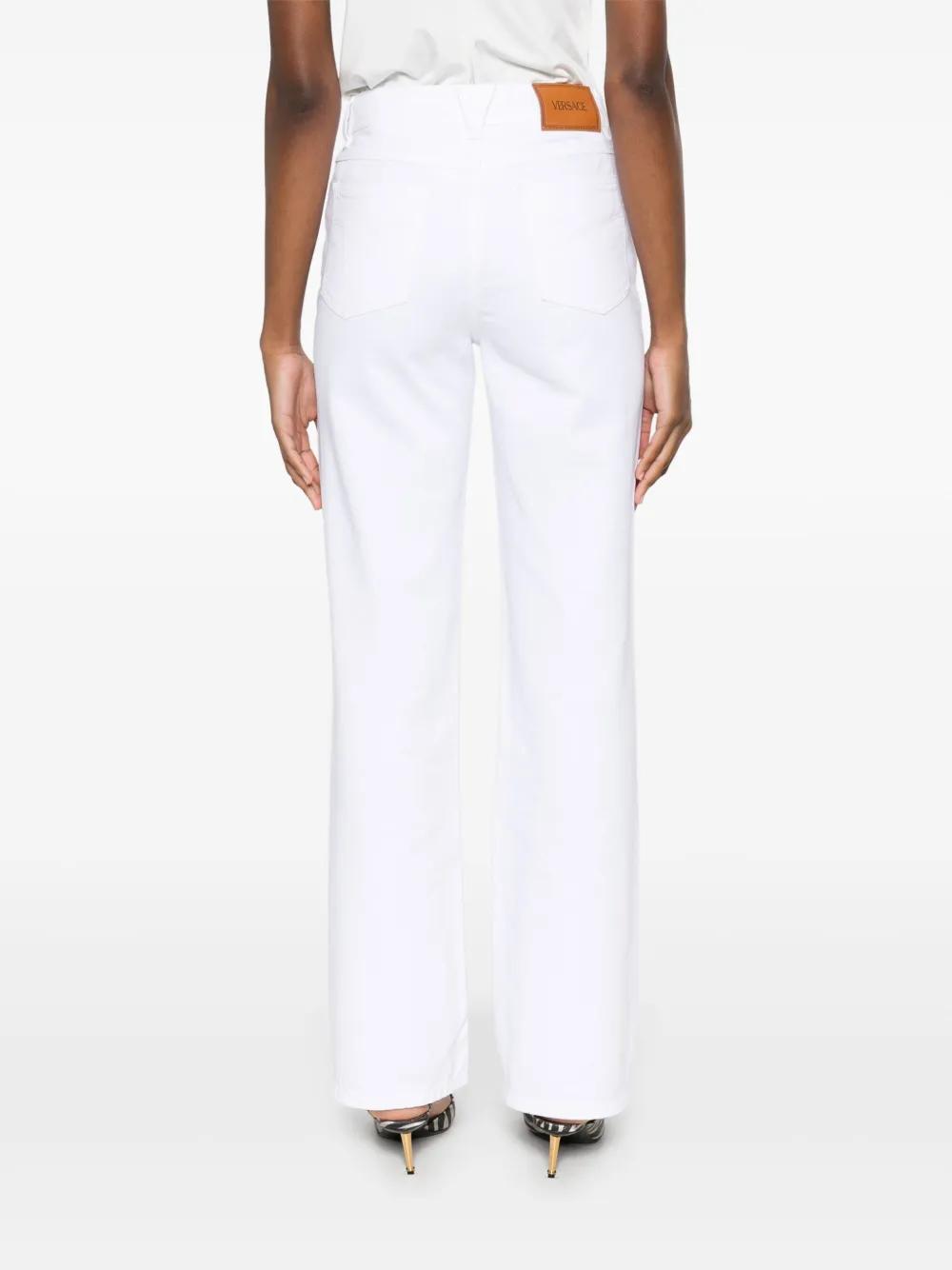 white concealed fly and button fastening belt loops classic five pockets logo patch to the rear
