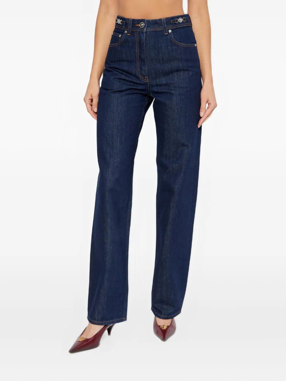 dark blue topstitching medusa hardware five pockets belt loops silver-tone hardware