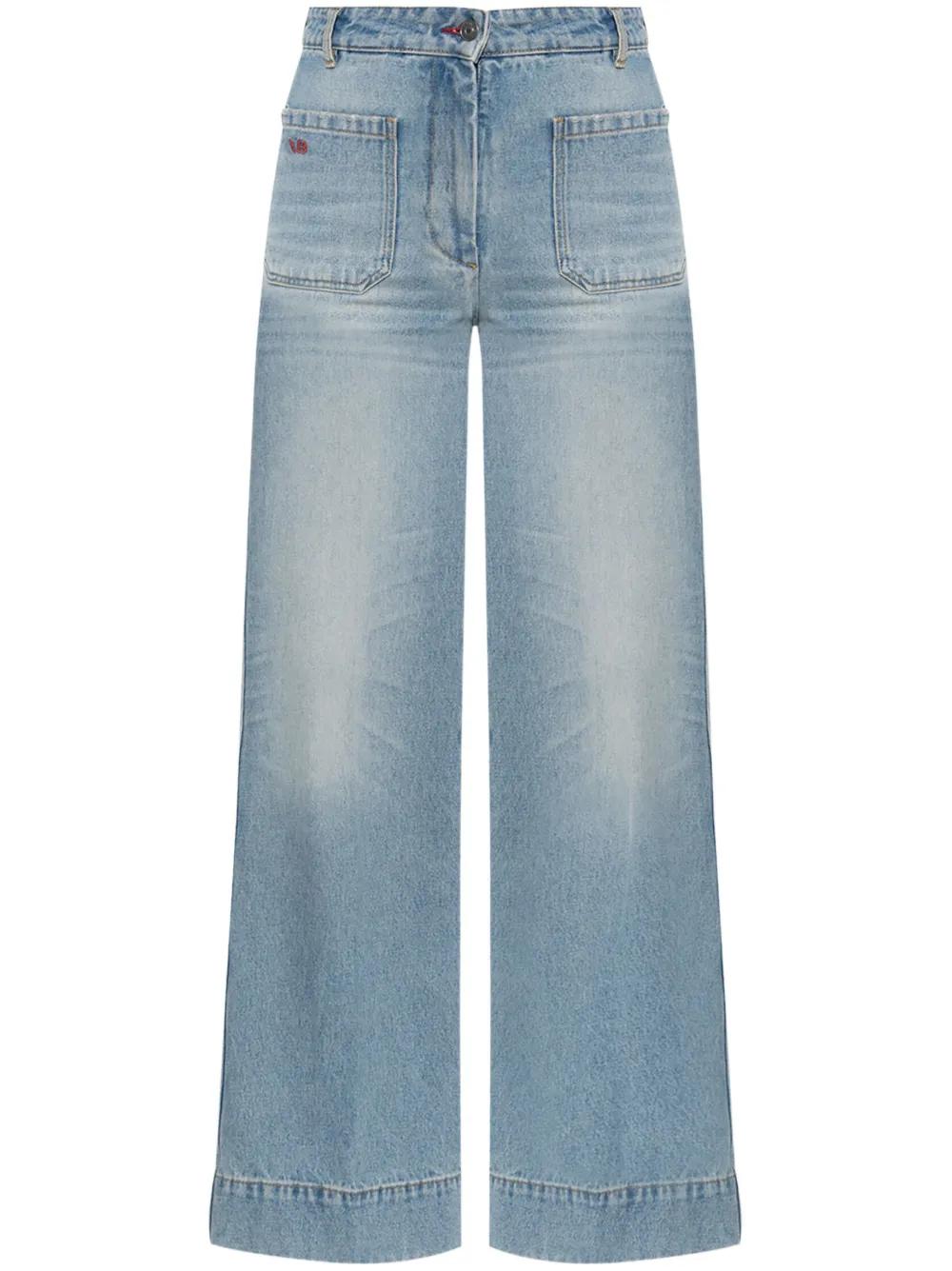 indigo blue front button and zip fastening two front patch pockets two rear patch pockets embroidered logo to the front