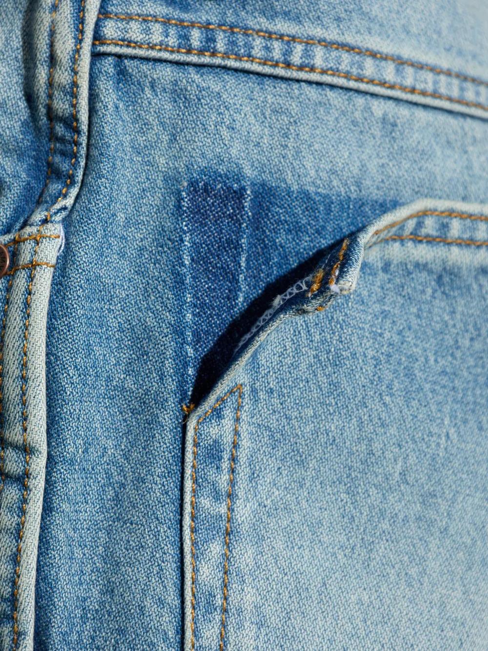 light blue cotton washed denim faded effect contrast stitching classic five pockets belt loops front button and zip fastening straight hem
