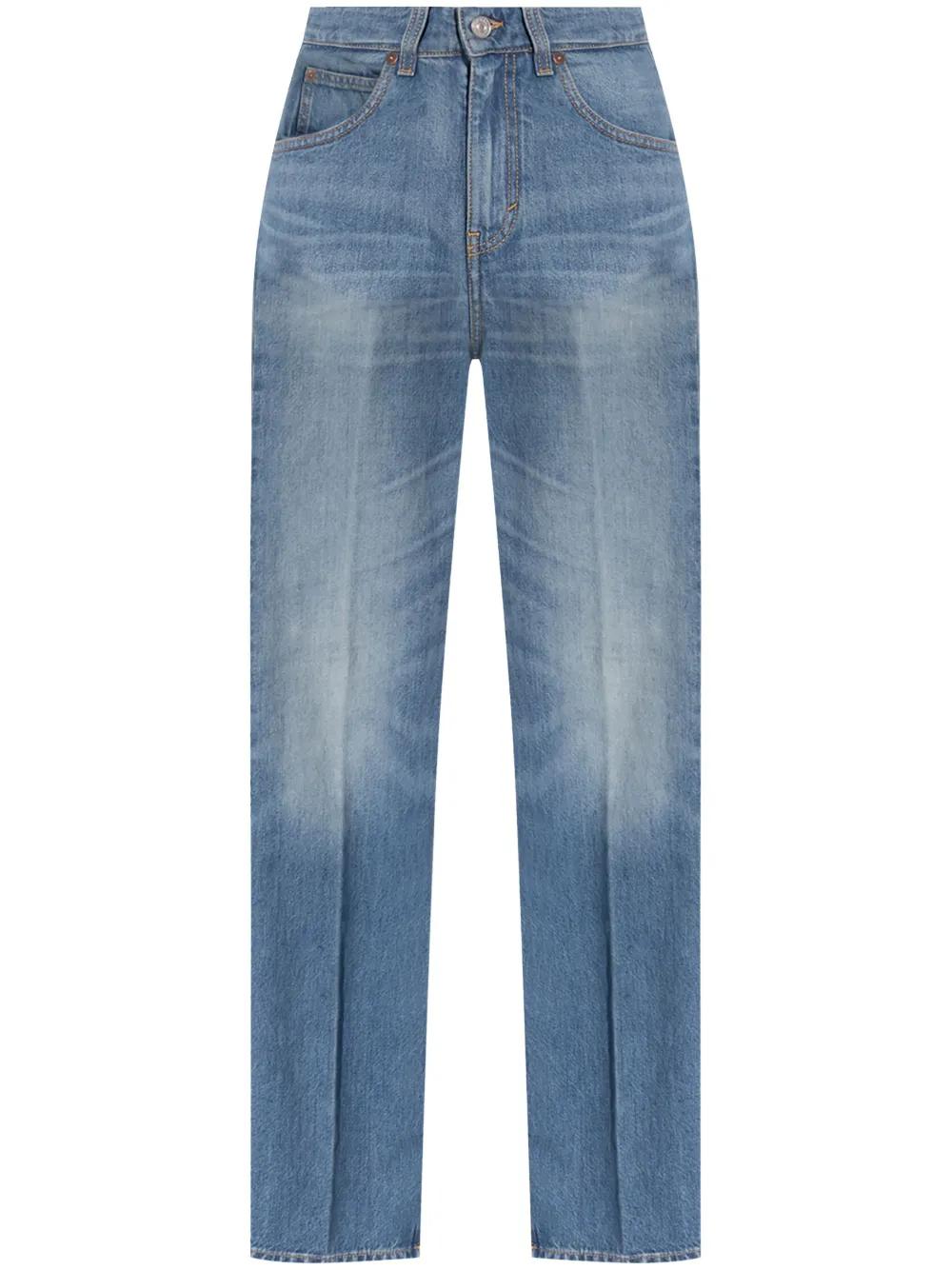 indigo blue cotton washed denim whiskering effect rivet detailing pressed crease appliqué logo high-rise concealed fly and button fastening belt loops straight leg classic five pockets