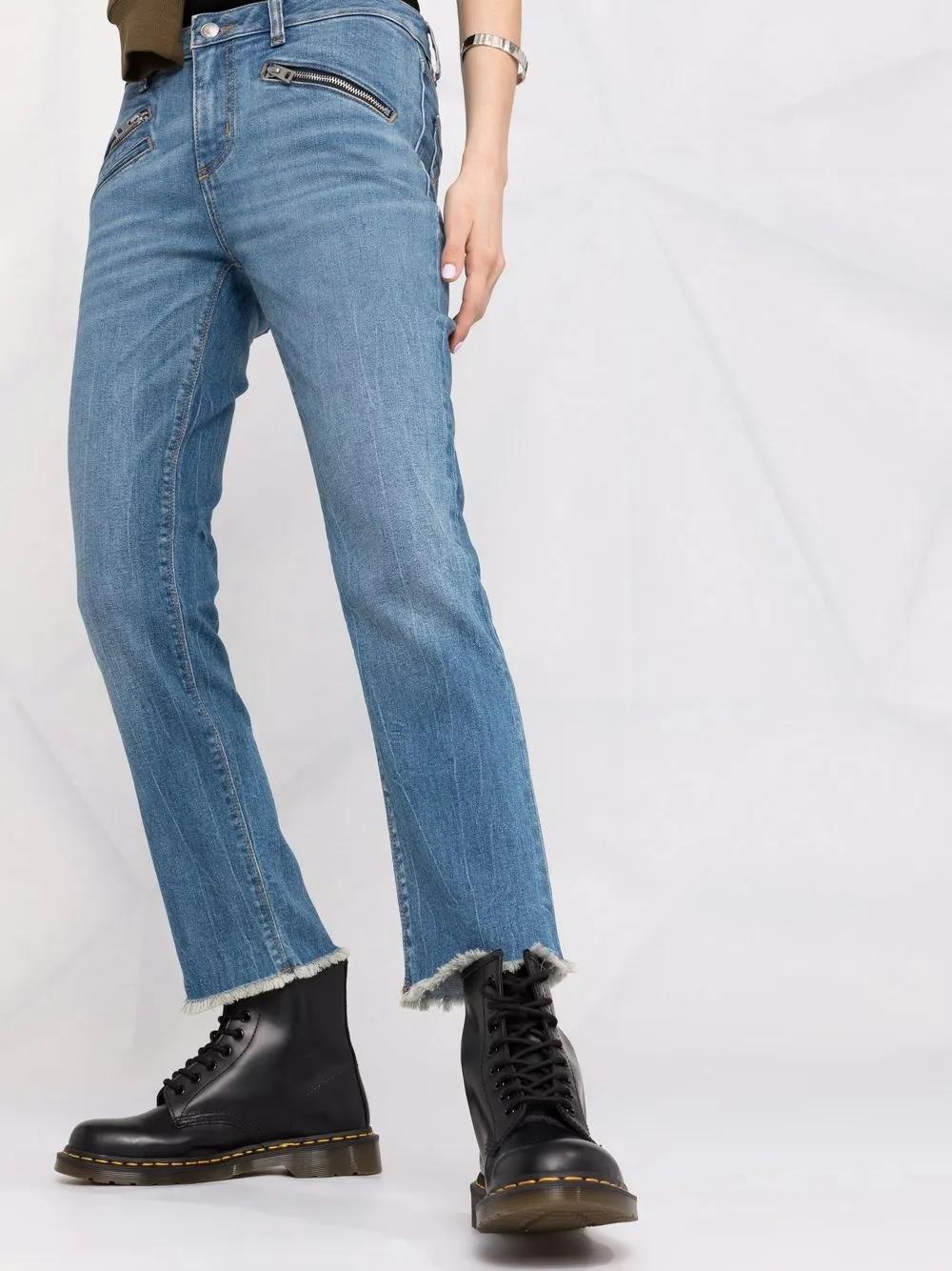 blue organic cotton-blend mid-rise belt loops front button and zip fastening classic five pockets slim cut faded effect cropped leg frayed detailing